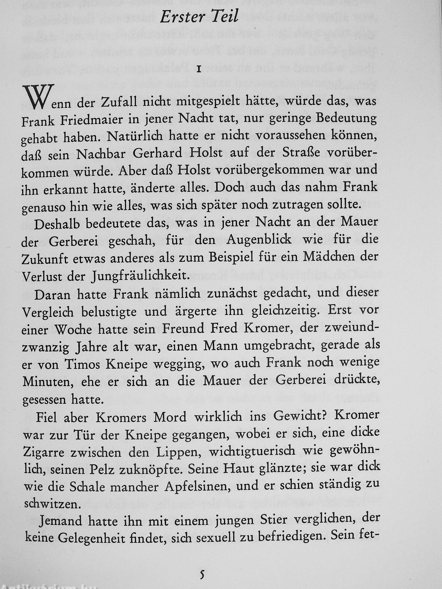 Die Erzählung spielt in einem besetzten Land während des Zweiten Weltkriegs. Frank, der ohne Liebe aufgewachsene, früh schon zynische Sohn einer Bordellbesitzerin, wird zum Verbrecher und Mörder. Erst im Gefängnis beginnt er nachzudenken.