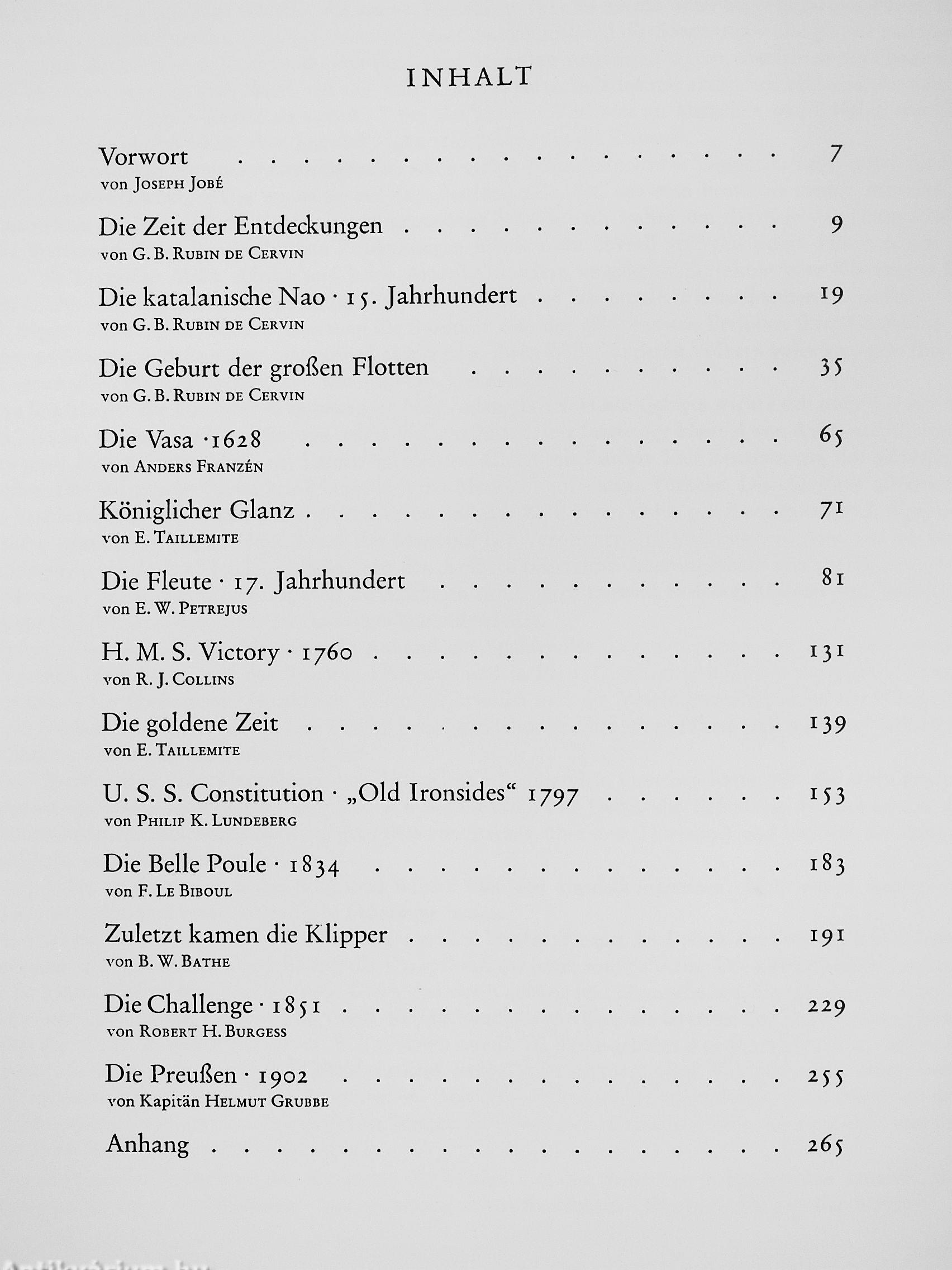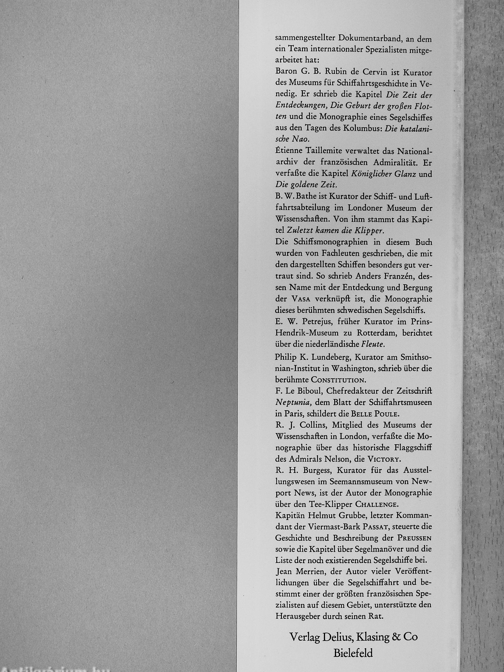 R. J. Collins, Mitglied des Museums der Wissensdiaften in London, verfaßte die Monographie über das historische Flaggschiff des Admirals Nelson, die Victory. R. H. Burgess, Kurator für das Ausstellungswesen im Seemannsmuseum von Newport News, ist der Autor der Monographie über den Tee-Klipper Challenge. Kapitän Helmut Grubbe, letzter Kommandant der Viermast-Bark Passat, steuerte die Geschidite und Beschreibung der Preussen sowie die Kapitel über Segelmanöver und die Liste der noch existierenden Segelschiffe bei. Jean Metrien, der Autor vieler Veröflent-lidiungen über die Segelschiffahrt und bestimmt einer der größten französischen Spezialisten auf diesem Gebiet, unterstützte den Herausgeber durch seinen Rat.