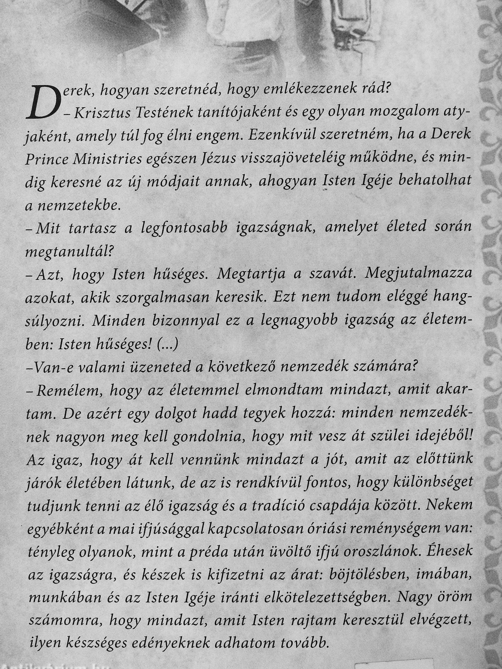 -Van-e valami üzeneted a következő nemzedék számára? -Remélem, hogy az életemmel elmondtam mindazt, amit akartam. De azért egy dolgot hadd tegyek hozzá: minden nemzedéknek nagyon meg kell gondolnia, hogy mit vesz át szülei idejéből! Az igaz, hogy át kell vennünk mindazt a jót, amit az előttünk járók életében látunk, de az is rendkívül fontos, hogy különbséget tudjunk tenni az élő igazság és a tradíció csapdája között. Nekem egyébként a mai ifjúsággal kapcsolatosan óriási reménységem van: tényleg olyanok, mint a préda után üvöltő ifjú oroszlánok. Éhesek az igazságra, és készek is kifizetni az árat: böjtölésben, imában, munkában és az Isten Igéje iránti elkötelezettségben. Nagy öröm számomra, hogy mindazt, amit Isten rajtam keresztül elvégzett, ilyen készséges edényeknek adhatom tovább. Vissza