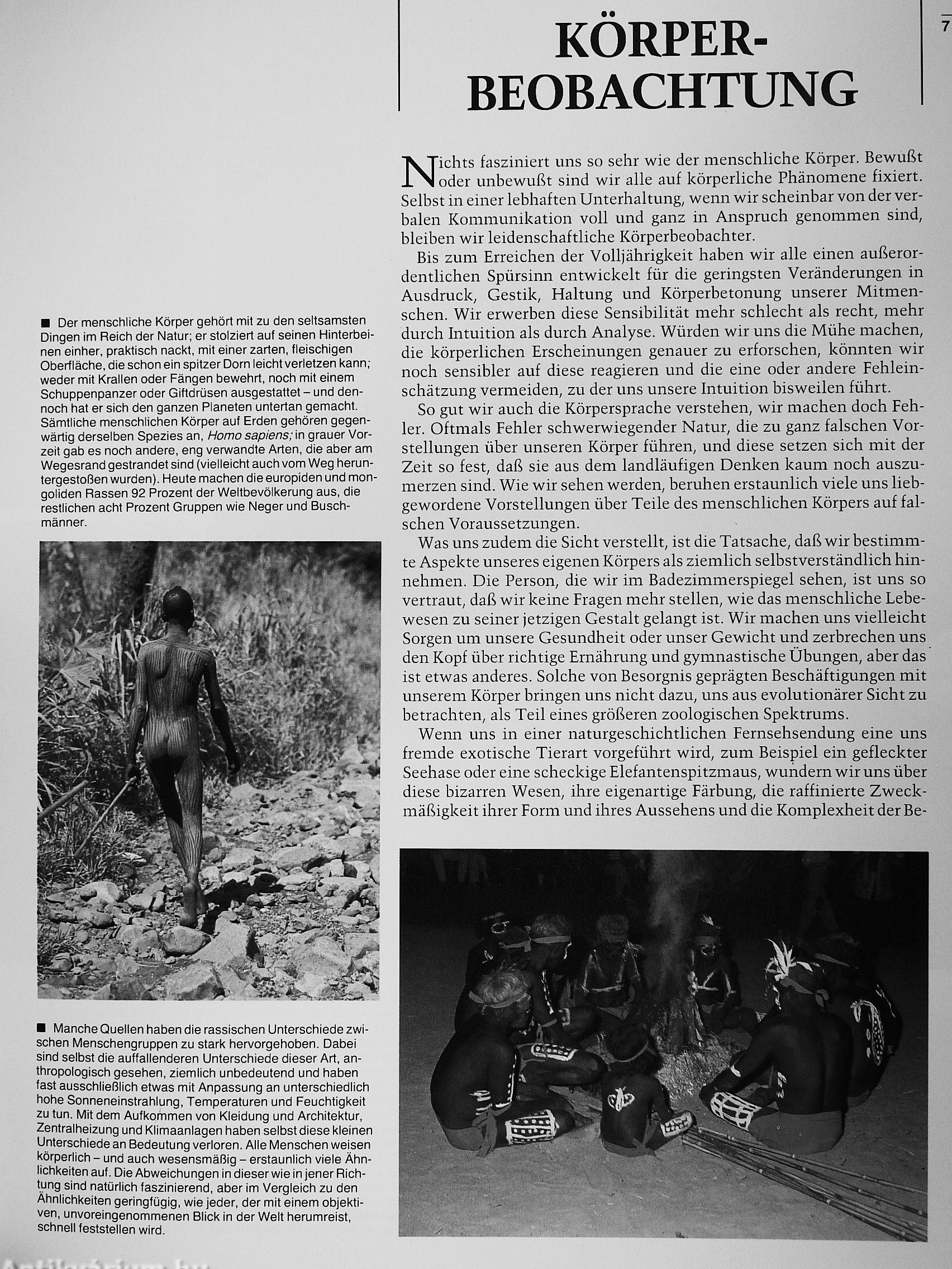Unser Körper ist weich, verletzbar und doch enorm leistungsfähig. Mit ihm haben wir uns die Erde Untertan gemacht. Wir kennen ihn, sind so mit ihm vertraut, daß wir gar nicht mehr darüber nachdenken, weshalb er so geworden ist, wie er ist. Tun wir es doch, werden wir plötzlich zu Expeditionsreisenden, die ein unbekanntes Land entdecken.