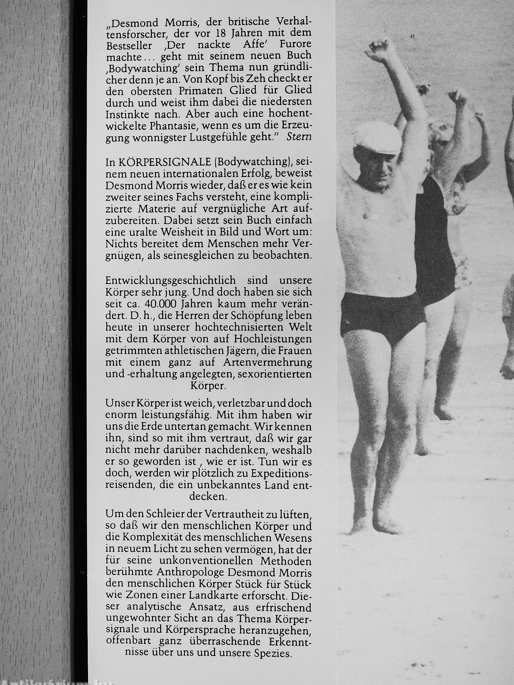„Desmond Morris, der britische Verhaltensforscher, der vor 18 Jahren mit dem Bestseller ,Der nackte Affe' Furore machte geht mit seinem neuen Buch ,Bodywatching' sein Thema nun gründU-cher denn je an. Von Kopf bis Zeh checkt er den obersten Primaten Glied für Glied durch und weist ihm dabei die niedersten Instinkte nach. Aber auch eine hochentwickelte Phantasie, wenn es um die Erzeugung wonnigster Lustgefühle geht." Stem