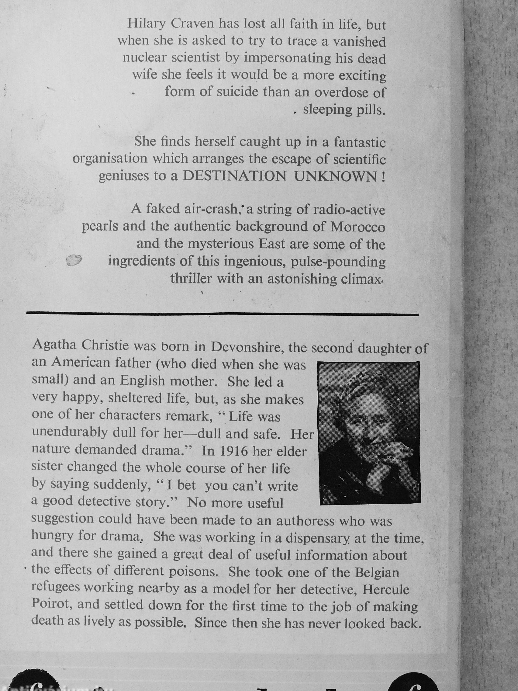 Agatha Christie was born in Devonshire, the second daughter of an American father (who died when she was small) and an English mother. She led a very happy, sheltered life, but, as she makes one of her characters remark, " Life was unendurably dull for her—dull and safe. Her| nature demanded drama." In 1916 her elder sister changed the whole course of her life by saying suddenly, " I bet you can't write a good detective story." No more useful suggestion could have been made to an authoress who was hungry for drama. She was working in a dispensary at the time, and there she gained a great deal of useful information about • the effects of different poisons. She took one of the Belgian refugees working nearby as a model for her detective, Hercule Poirot, and settled down for the first time to the job of making death as lively as possible. Since then she has never looked back.