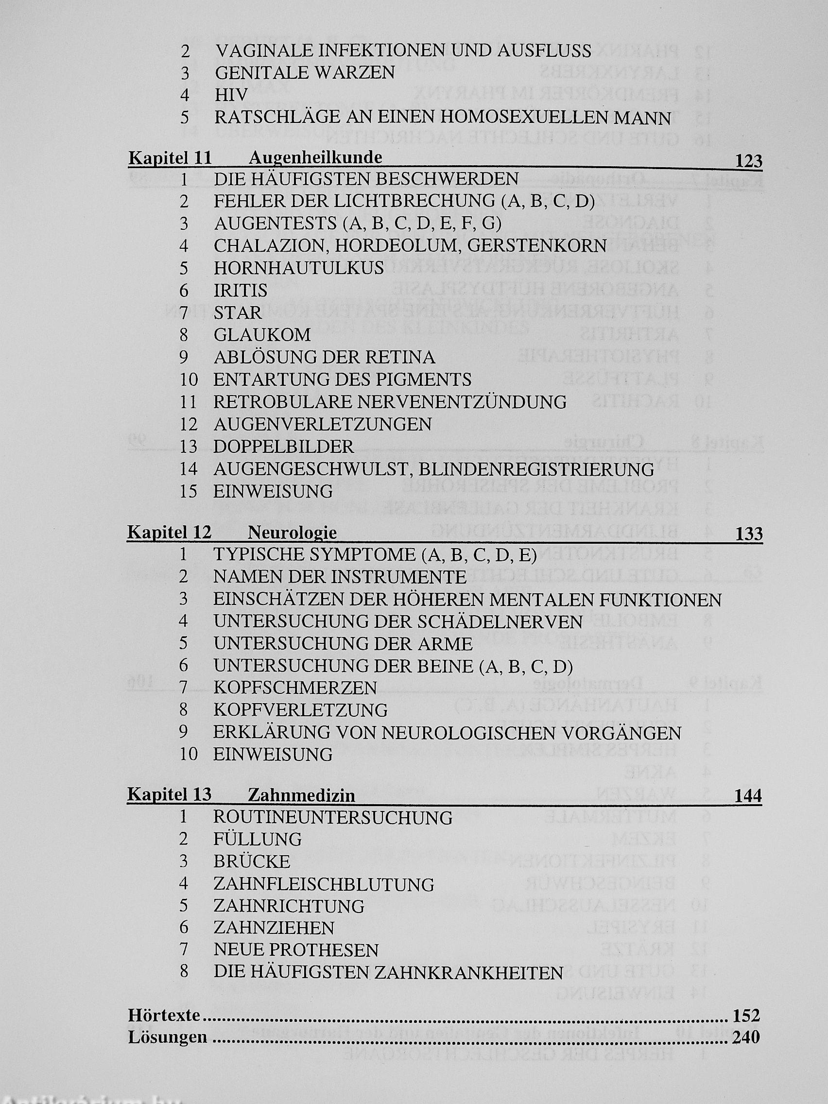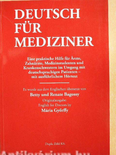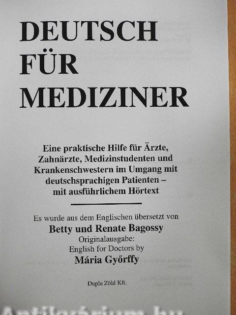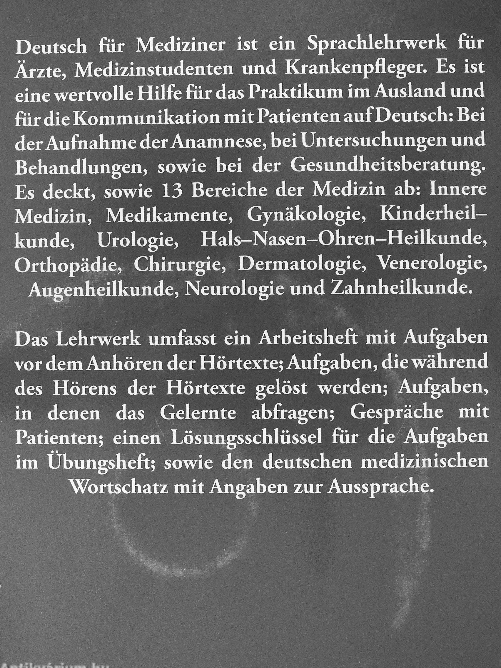 Deutsch fíir Mediziner ist ein Sprachlehrwerk fiiir Ärzte, Medizinstudenten und Krankenpfleger. Es ist eine wertvolle Hilfe fíir das Praktikum im Ausland und fiiir die Kommunikation mit Patienten auf Deutsch: Bei der Aufnahme der Anamnese, bei Untersuchungen und Behandlungen, sowie bei der Gesundheitsberatung. Es deckt, sowie 13 Bereiche der Medizin ab: Innere Medizin, Medikamente, Gynäkologie, Kinderheilkunde, Urologie, Hals-Nasen-Ohren-Heilkunde, Orthopädie, Chirurgie, Dermatologie, Venerologie, Augenheilkunde, Neurologie und Zahnheilkunde.