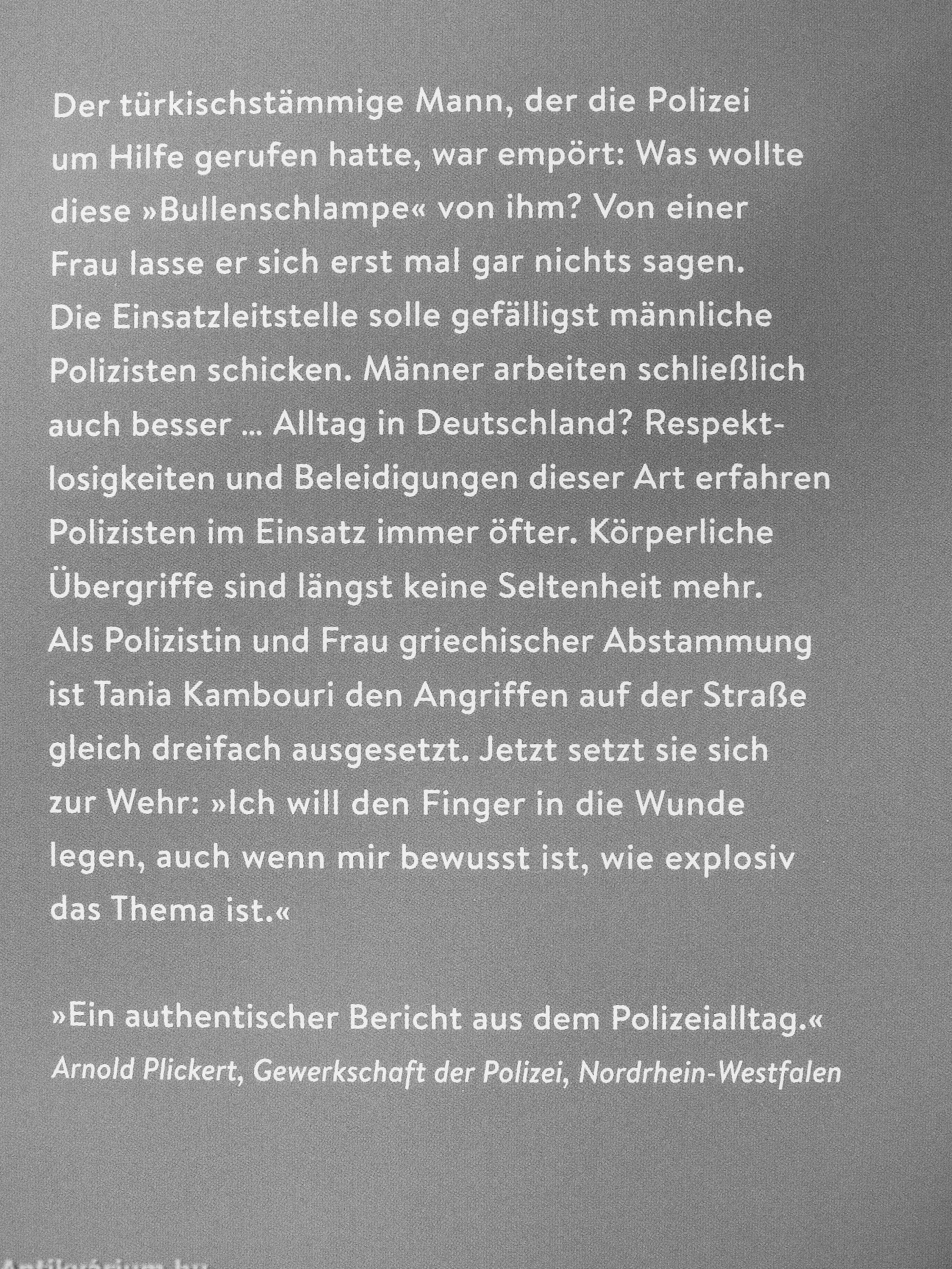 Der türkischstämmige Mann, der die Polizei um Hilfe gerufen hatte, war empört: Was wollte diese »Bullenschlampe« von ihm? Von einer Frau lasse er sich erst mal gar nichts sagen. Die Einsatzleitstelle solle gefälligst männliche Polizisten schicken. Männer arbeiten schließlich auch besser Alltag in Deutschland? Respektlosigkeiten und Beleidigungen dieser Art erfahren Polizisten im Einsatz immer öfter. Körperliche Übergriffe sind längst keine Seltenheit mehr. Als Polizistin und Frau griechischer Abstammung ist Tania Kambouri den Angriffen auf der Straße gleich dreifach ausgesetzt. Jetzt setzt sie sich zur Wehr: »Ich will den Finger in die Wunde legen, auch wenn mir bewusst ist, wie explosiv das Thema ist.«