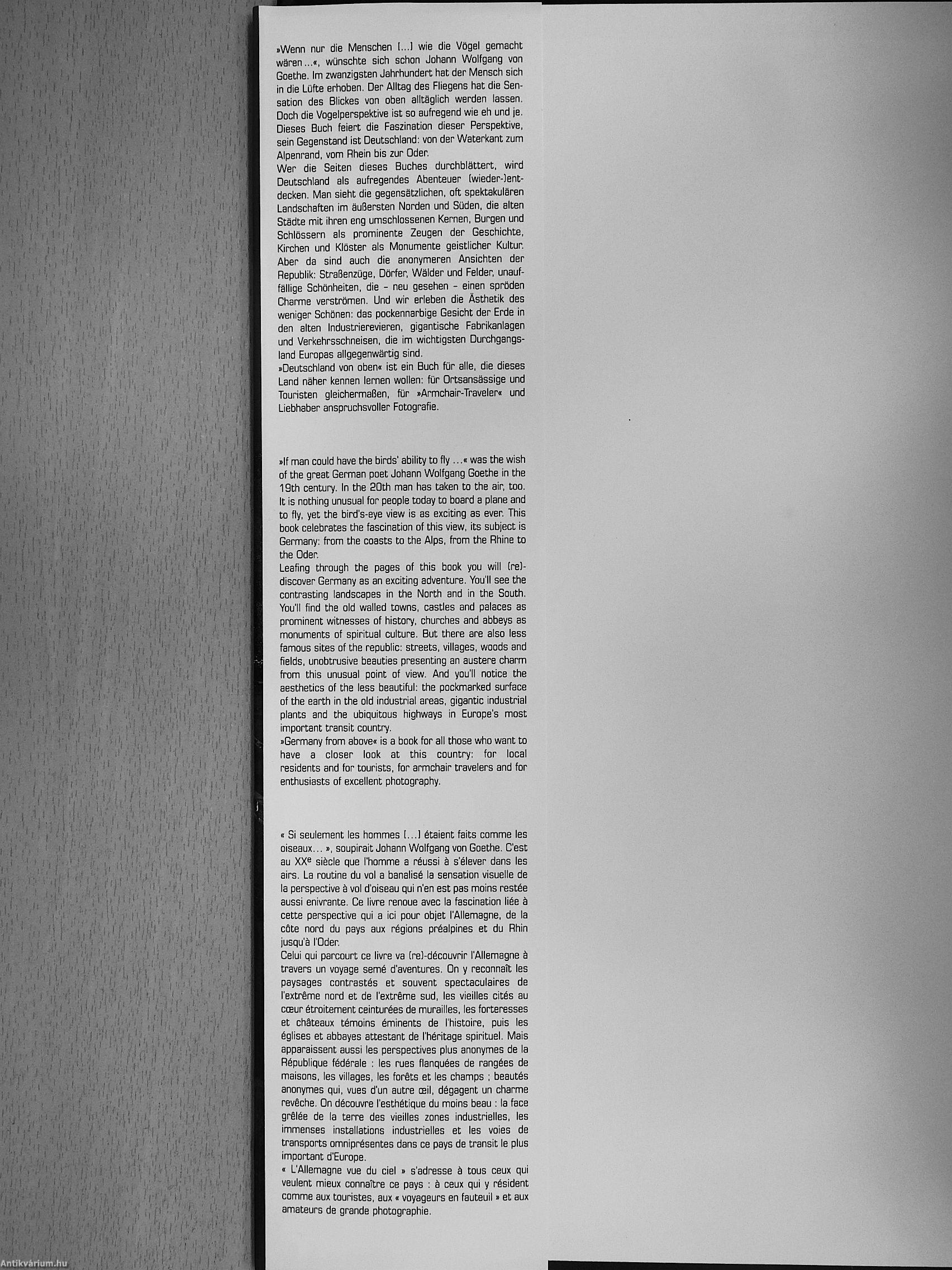 •If man could have the birds' ability to fly .,.«was the wish of the great German poet Johann Wolfgang Goethe in the 19th cenujry. In the 20th man has taken to the air, too. It is nothing unusual for people today to board a plane and to fly, yet the bird's-eye view is as exciting as ever This book celebrates the fascination of this view, its subject is Germany: from the coasts to the Alps, from the Rhine to the Oder.