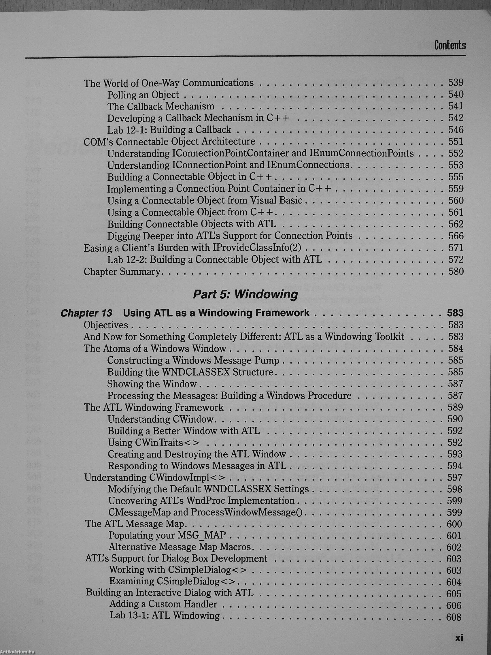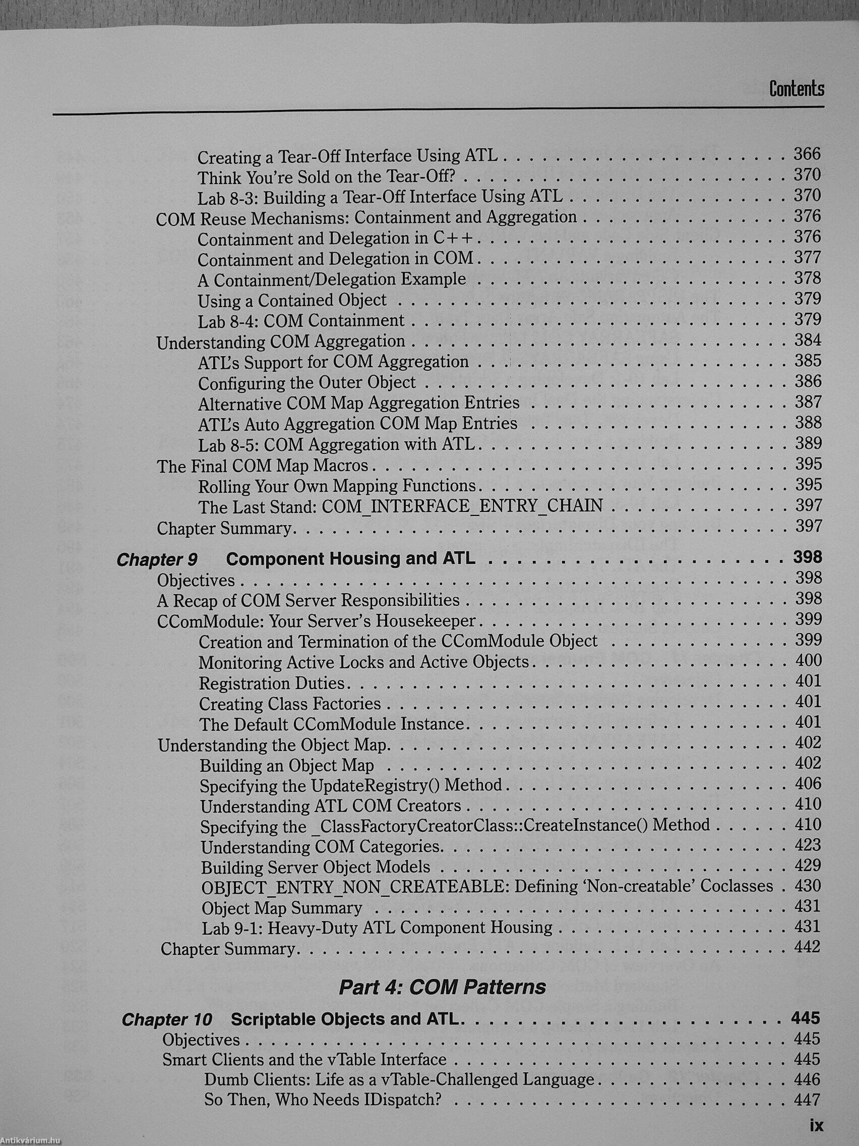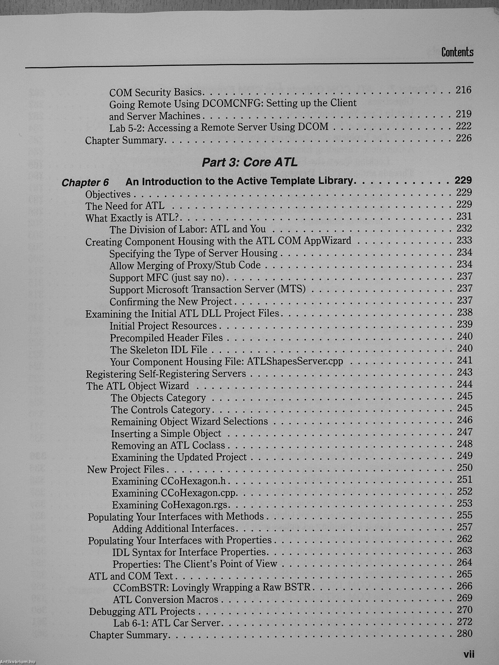 The book is divided into five sections, each focusing on a particular aspect of COM and ATL development. The book begins with a review of object-oriented and interface-based programming techniques, then moves into the core aspects of COM, including a fiill examination of language independence and location transparency. The author illustrates the numerous CASE tools used during ATL development and discusses apartments, COM exceptions, object identity, and component housing, in addition to various advanced concepts such as COM categories and tear-off interfaces. The fourth section examines a number of "COM patterns" such as enumerators, collections, scriptable objects, and callback interfaces. The book closes with an investigation of using ATL as a windowing framework and wraps up with the development of a full-blown animated ActiveX control using ATL.
