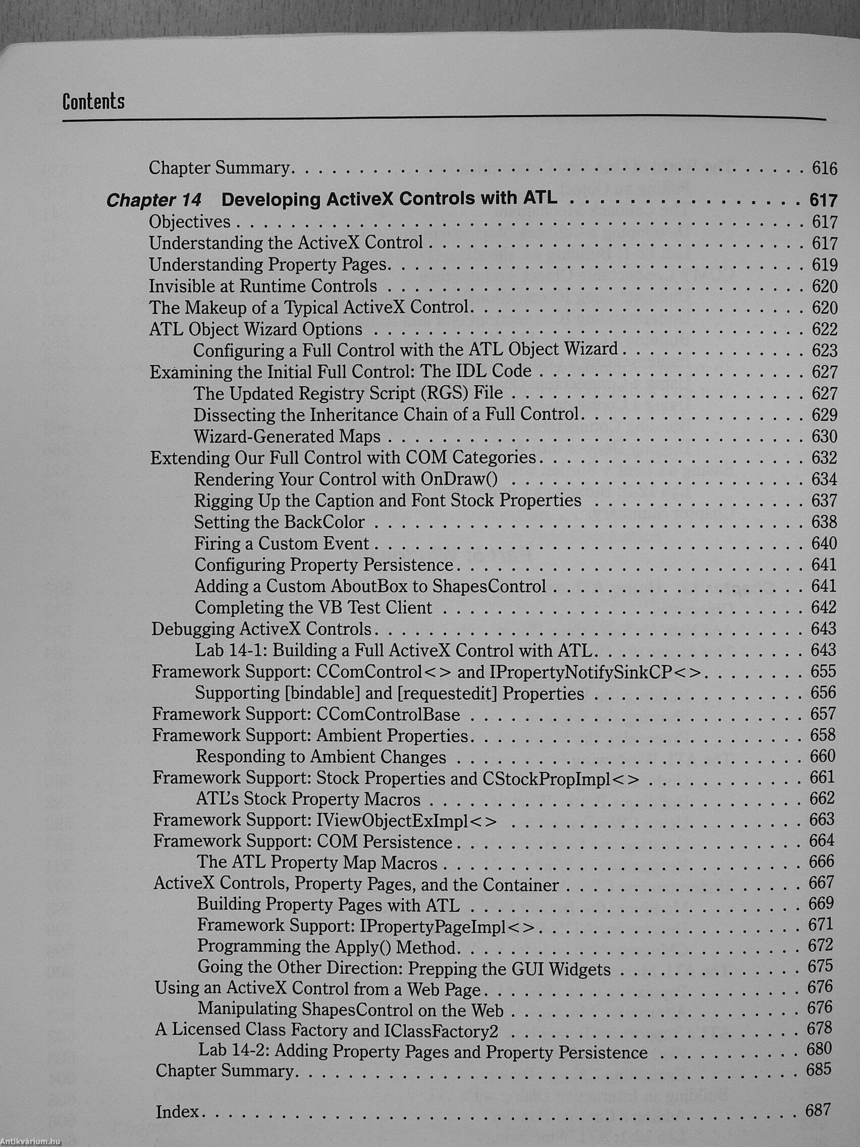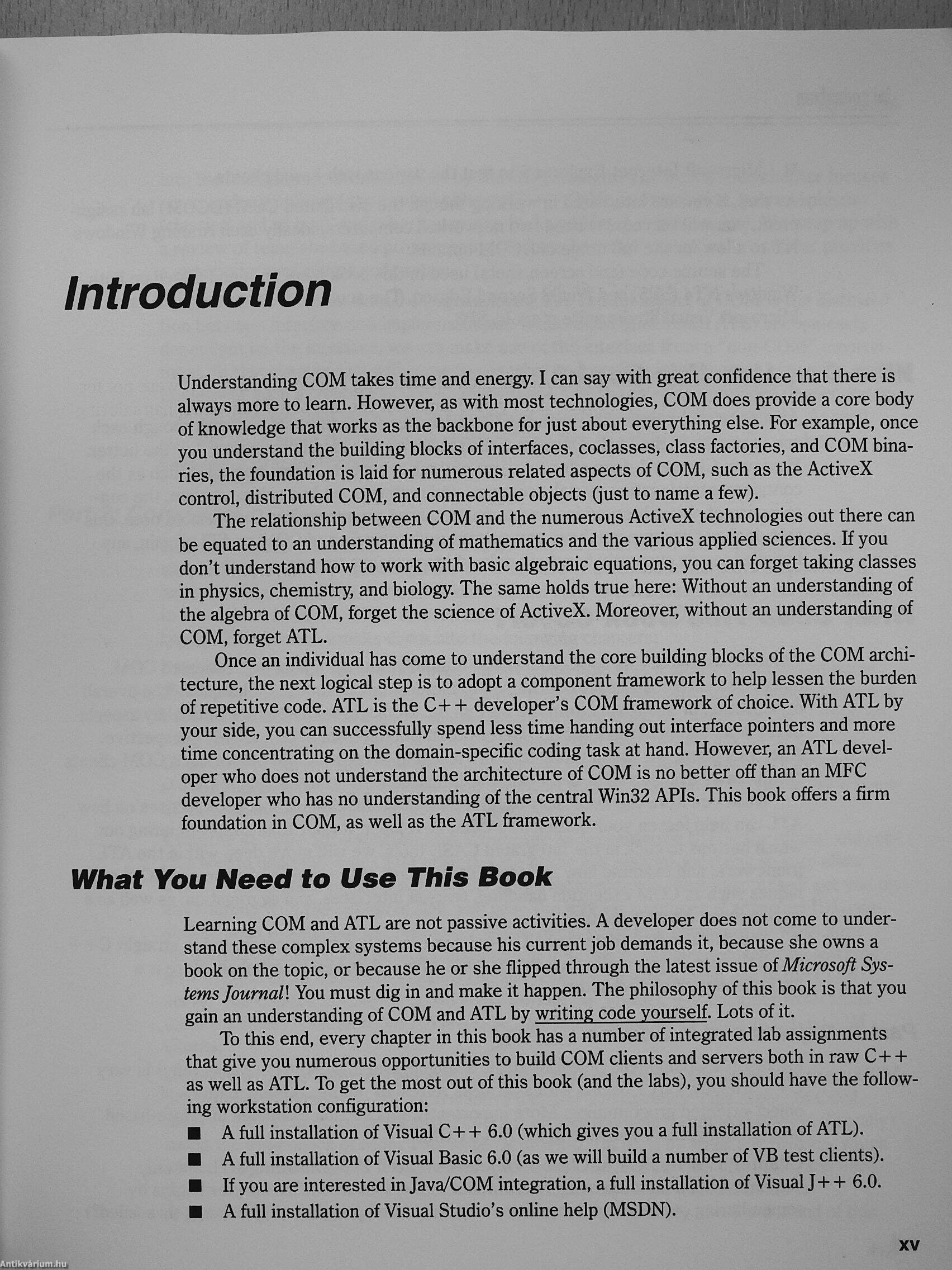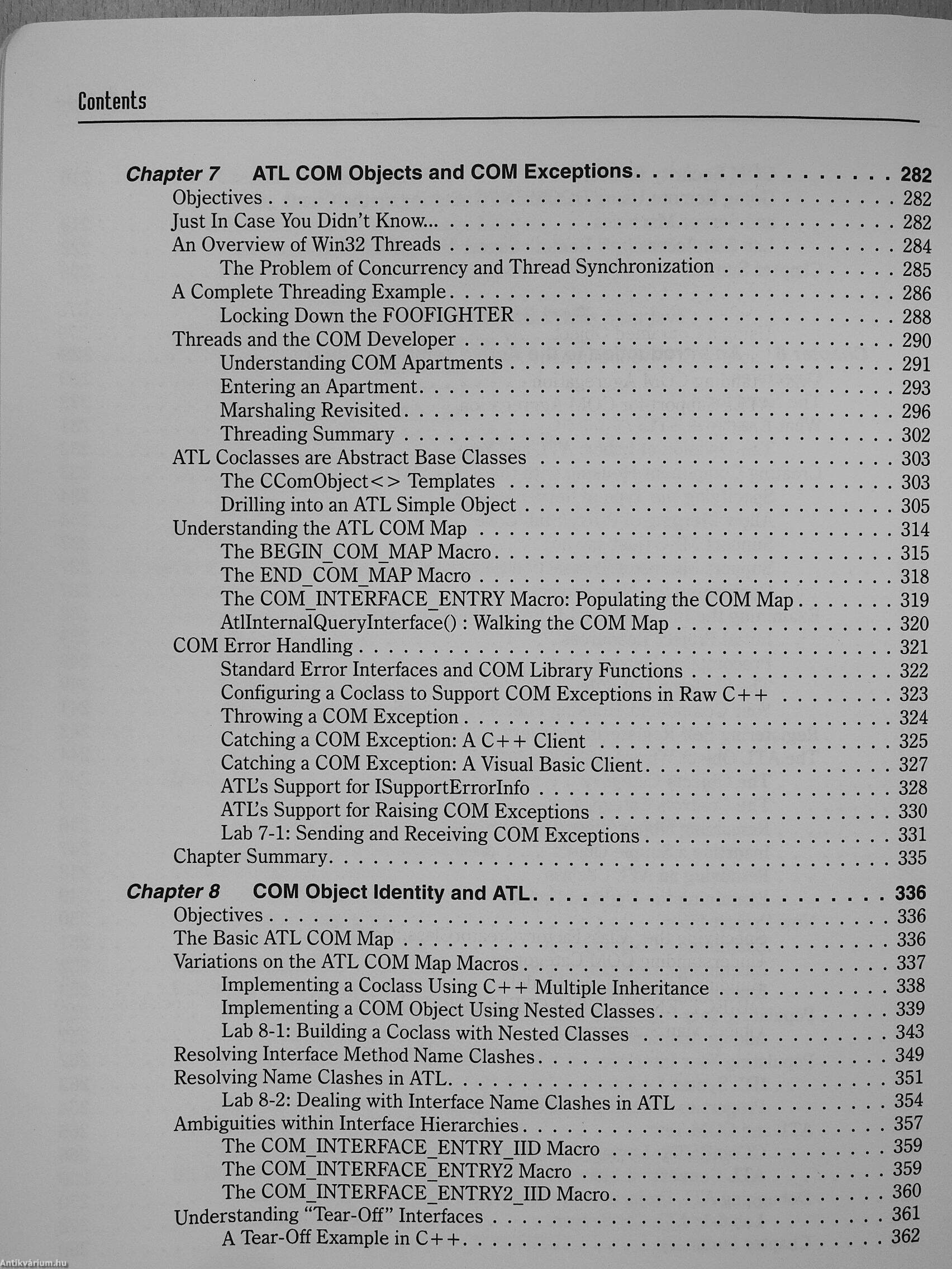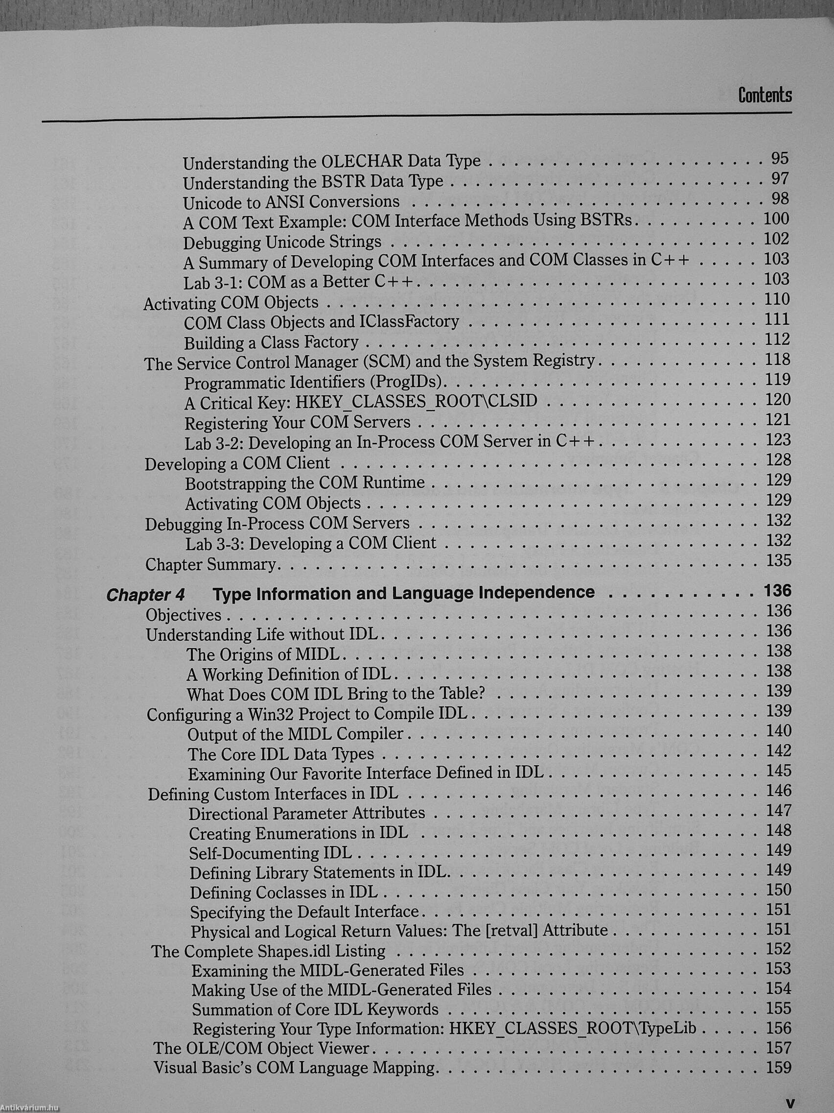 The book is divided into five sections, each focusing on a particular aspect of COM and ATL development. The book begins with a review of object-oriented and interface-based programming techniques, then moves into the core aspects of COM, including a fiill examination of language independence and location transparency. The author illustrates the numerous CASE tools used during ATL development and discusses apartments, COM exceptions, object identity, and component housing, in addition to various advanced concepts such as COM categories and tear-off interfaces. The fourth section examines a number of "COM patterns" such as enumerators, collections, scriptable objects, and callback interfaces. The book closes with an investigation of using ATL as a windowing framework and wraps up with the development of a full-blown animated ActiveX control using ATL.