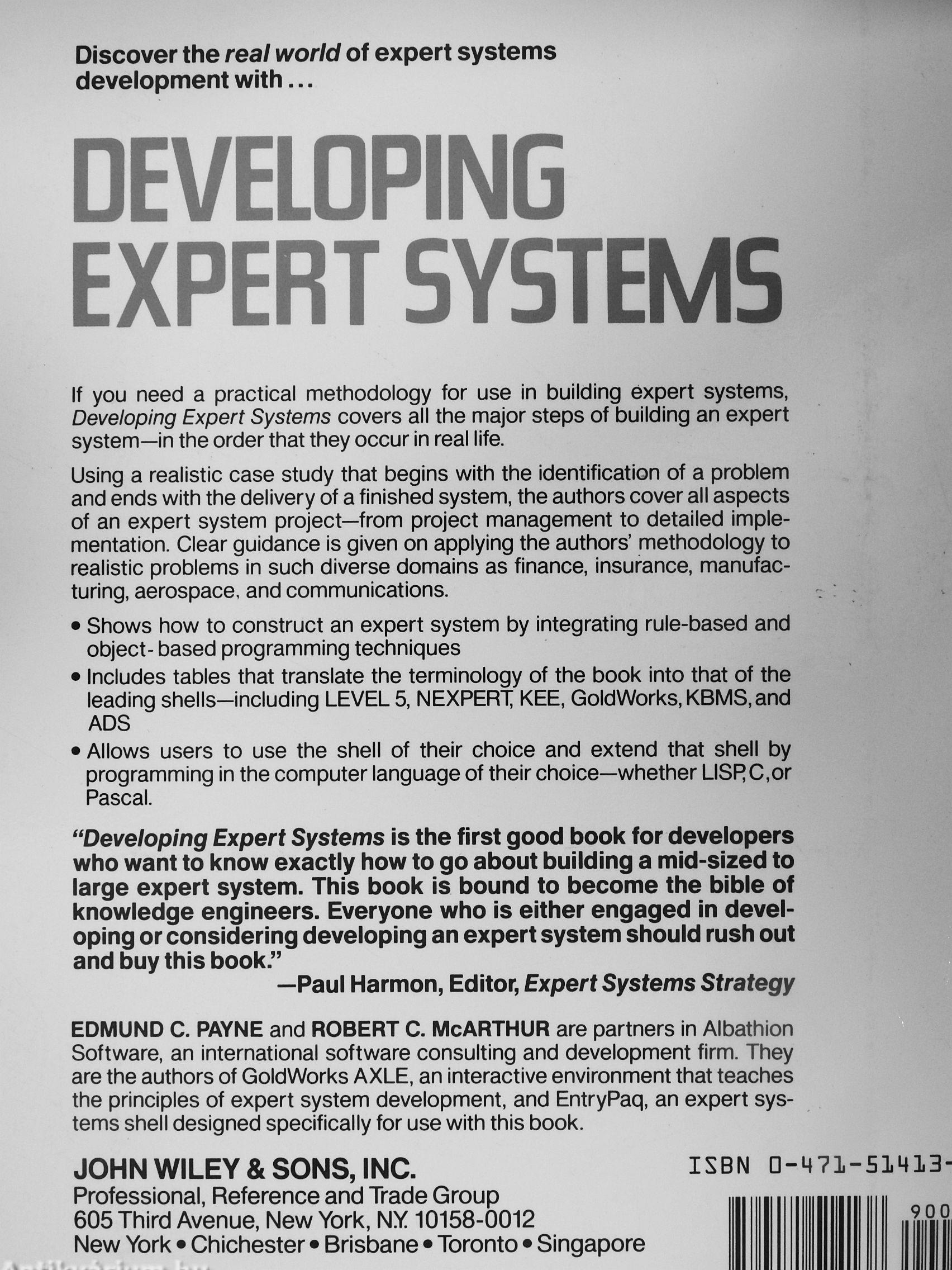 If you need a practical methodology for use in building expert systems, Developing Expert Systems covers all the major steps of building an expert system—in the order that they occur in real life.