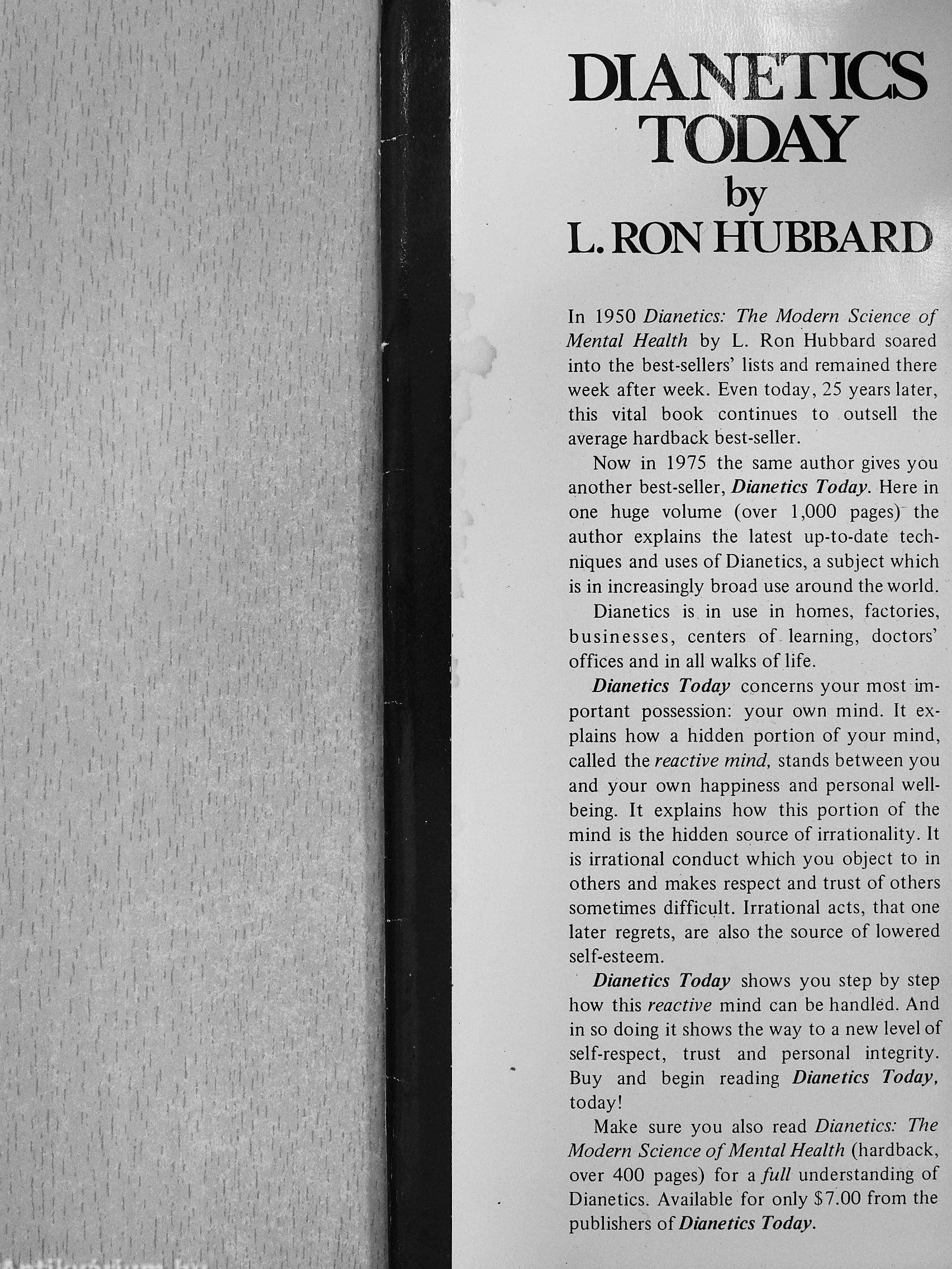 Now in 1975 the same author gives you another best-seller, Dianetics Today. Here in one huge volume (over 1,000 pages)" the author explains the latest up-to-date techniques and uses of Dianetics, a subject which is in increasingly broad use around the world.
