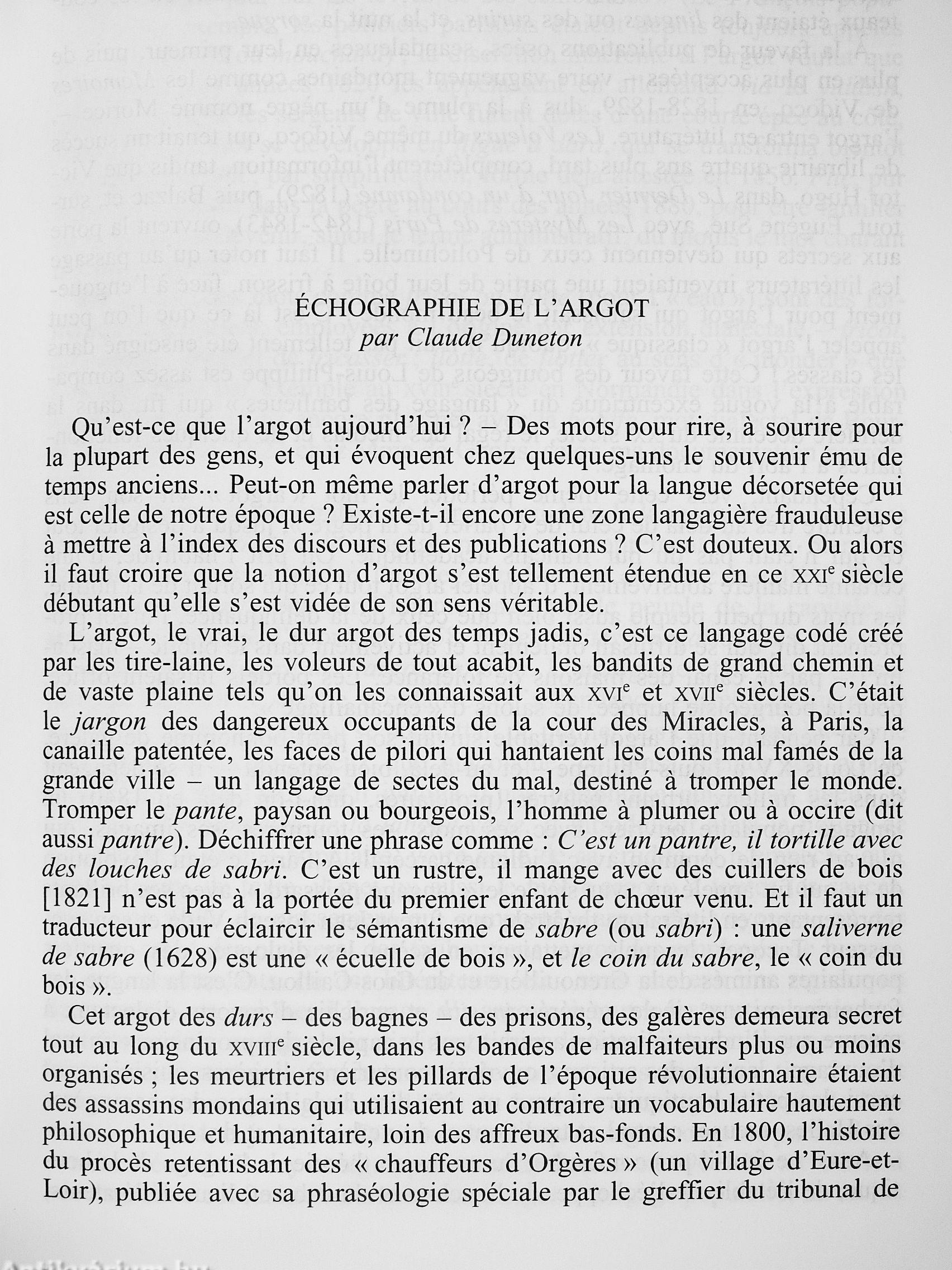 Dans sa préface, Claude Duneton rappelle que « l'argot, le vrai, le dur argot des temps jadis, c'est le langage codé créé par les tire-laine, les voleurs de tout acabit, les bandits de grands chemins ». Ce langage est devenu, avec le temps, une langue parallele, authentique et populaire, pleine de brio et de fantaisie, qui n'a cessé de se renouveler et de s'enrichir.