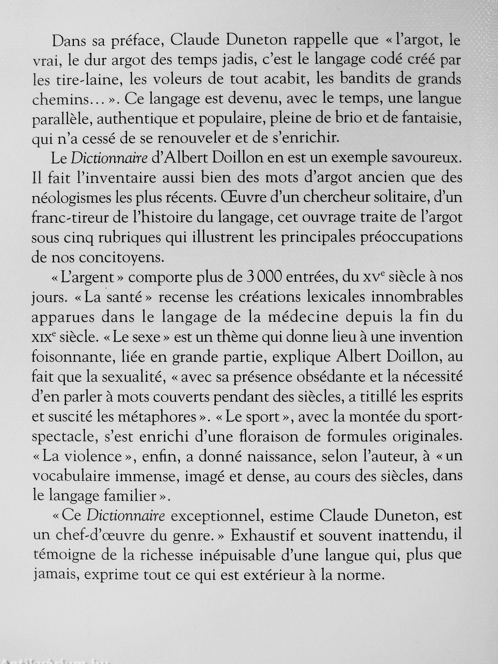 Le Dictionnaire d'Albert Doillon en est un exemple savoureux. Il fait l'inventaire aussi bien des mots d'argot ancien que des néologismes les plus récents. Ouvre d'un chercheur solitaire, d'un franc-tireur de l'histoire du langage, cet ouvrage traite de l'argot sous cinq rubriques qui illustrent les principales préoccupations de nos concitoyens.