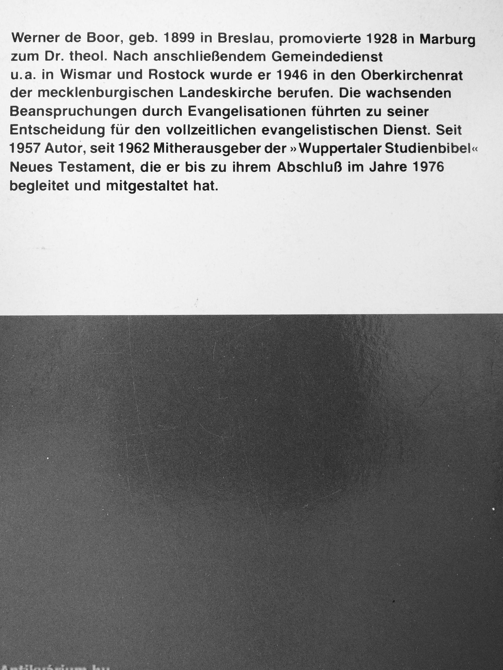 Werner de Boor, geb. 1899 in Breslau, promovierte 1928 in Marburg zum Dr. theol. Nach anschließendem Gemeindedienst u.a. in Wismar und Rostock wurde er 1946 in den Oberkirchenrat der mecklenburgischen Landeskirche berufen. Die wachsenden Beanspruchungen durch Evangelisationen führten zu seiner Entscheidung für den vollzeitlichen evangelistischen Dienst. Seit 1957 Autor, seit 1962 Mitherausgeber der »Wuppertaler Studienbibel« Neues Testament, die er bis zu ihrem Abschluß im Jahre 1976 begleitet und mitgestaltet hat.