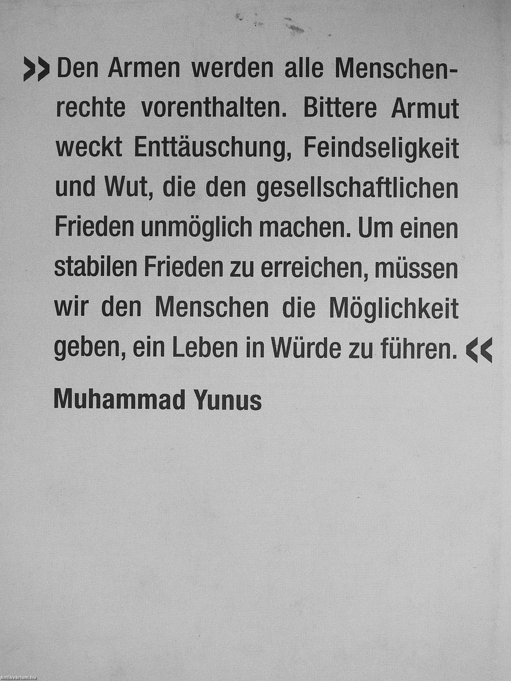 » Den Armen werden alle Menschenrechte vorenthalten. Bittere Armut weckt Enttäuschung, Feindseligkeit und Wut, die den gesellschaftlichen Frieden unmöglich machen. Um einen stabilen Frieden zu erreichen, müssen wir den Menschen die Möglichkeit geben, ein Leben in Würde zu führen.«