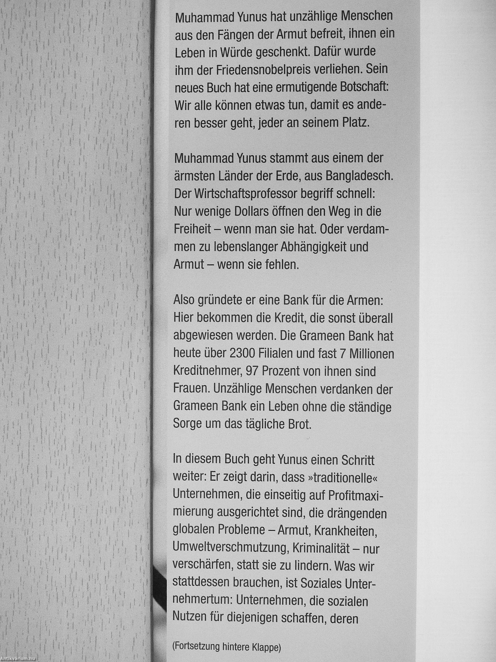 In diesem Buch geht Yunus einen Schritt weiter: Er zeigt darin, dass »traditionelle« Unternehmen, die einseitig auf Profitmaxi-mierung ausgerichtet sind, die drängenden globalen Probleme - Armut, Krankheiten, Umweltverschmutzung, Kriminalität - nur verschärfen, statt sie zu lindern. Was wir stattdessen brauchen, ist Soziales Unternehmertum: Unternehmen, die sozialen Nutzen für diejenigen schaffen, deren