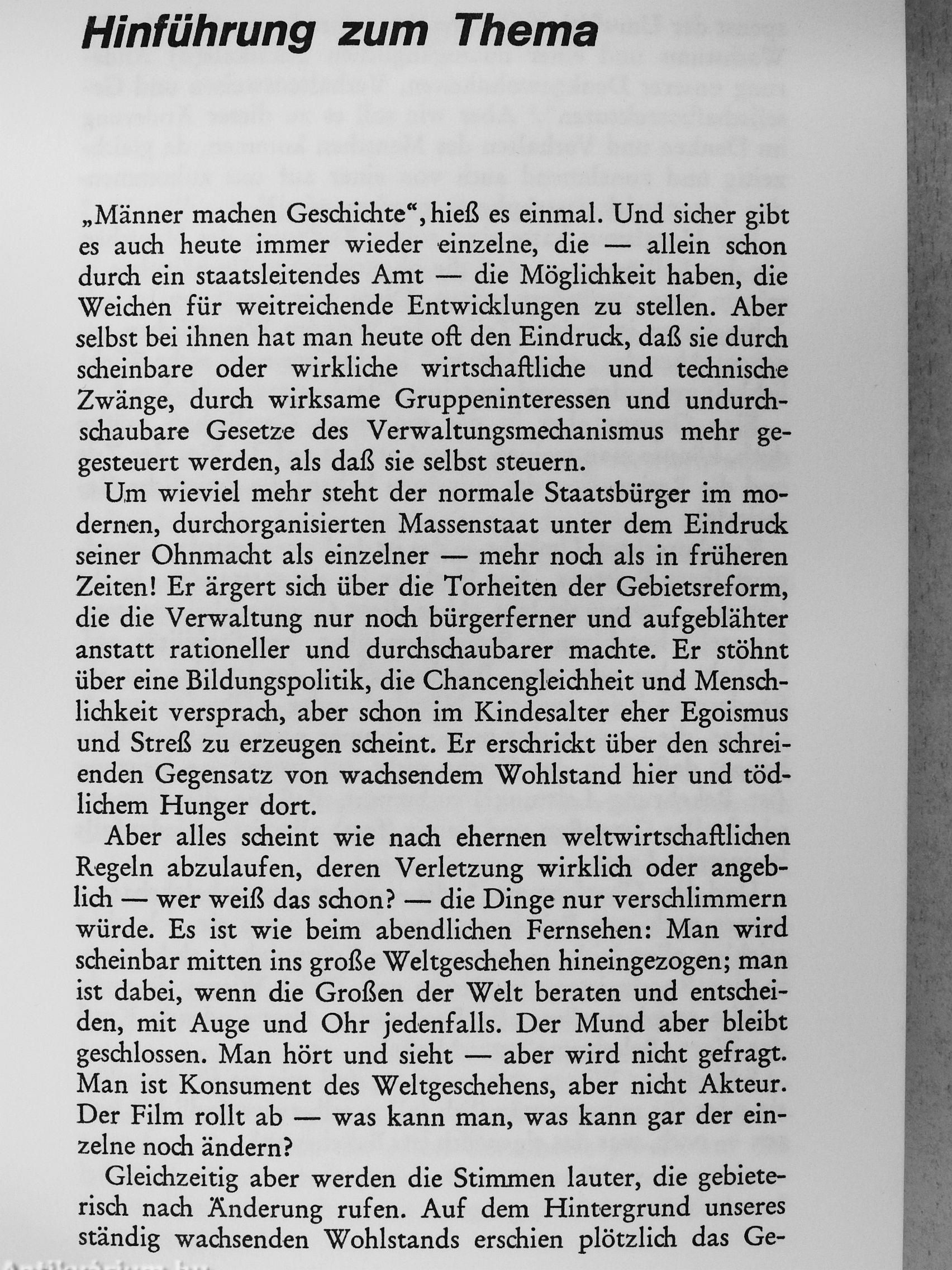 „Männer machen Geschichte" hieß es einmal. Aber selbst bei den Politikern hat man heute eher den Eindruck, daß sie mehr gesteuert werden als selbst steuern. Wieviel stärker steht der einzelne Staatsbürger unter dem Eindruck seiner Ohnmacht! Der Film rollt ab, was kann man daran noch ändern?
