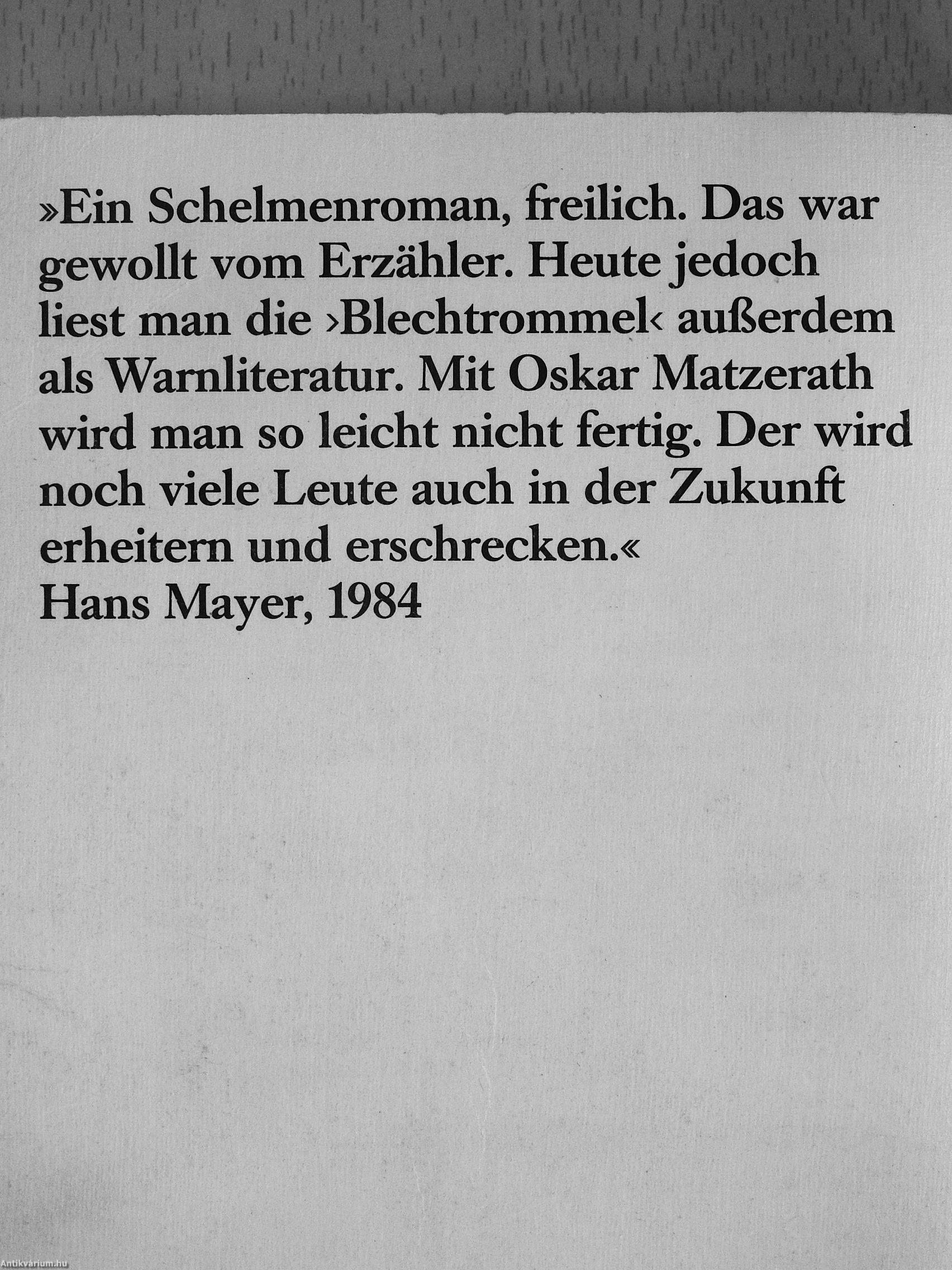 »Ein Schelmenroman, freilich. Das war gewollt vom Erzähler. Heute jedoch liest man die >Blechtrommel< außerdem als Wamliteratur. Mit Oskar Matzerath wird man so leicht nicht fertig. Der wird noch viele Leute auch in der Zukunft erheitern und erschrecken.« Hans Mayer, 1984
