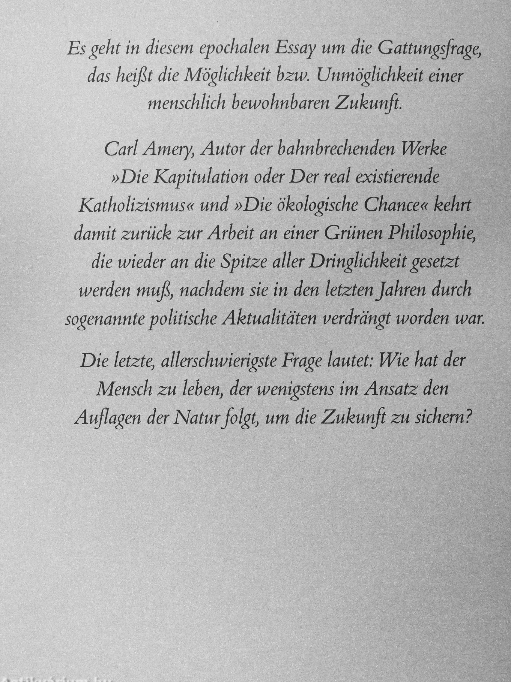 ten zu religiös-politischen und ökologischen Fragen hat Carl Amery bahnbrechend wichtige geistig-politische Anstöße gegeben. Die ökologische Chance wird heute als klassisches Hauptwerk der ökologischen Literatur gesehen, und über Die Kapitulation oder Der real existierende Katholizismus sagte Oskar Lafontaine, kaum ein anderes Buch habe das kritische Bewußtsein der jungen Nachkriegsgeneration von Katholiken so wachgerüttelt.