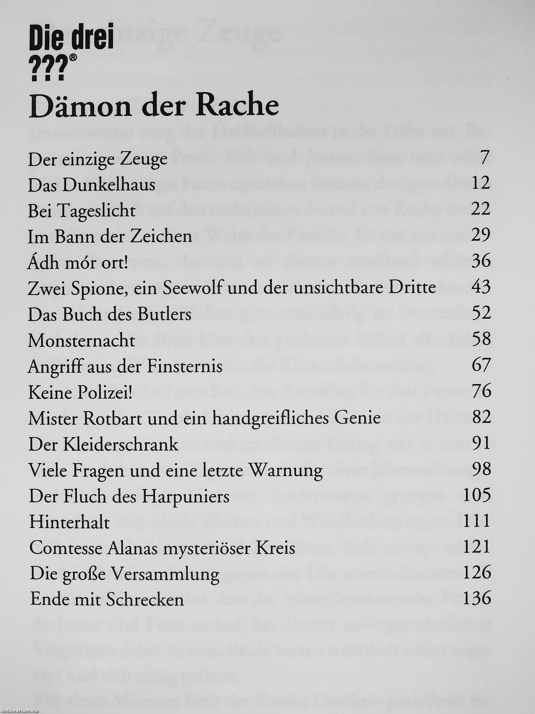 Bei einer Ballonfahrt entdeckt Peter in der Nähe einer abgelegenen Villa ein Monster. Eindeutig ein neuer Fall für die drei ???! Ihre Ermittlungen führen die Detektive zur seltsamen IVIrs Pembroke und ihrem Neffen Luke. Die beiden werden von der grässlichen Gestalt bedroht. Luke bittet Justus, Peter und Bob um Hilfe. Doch schnell wird klar: Der Dämon der Rache ist nicht aufzuhalten