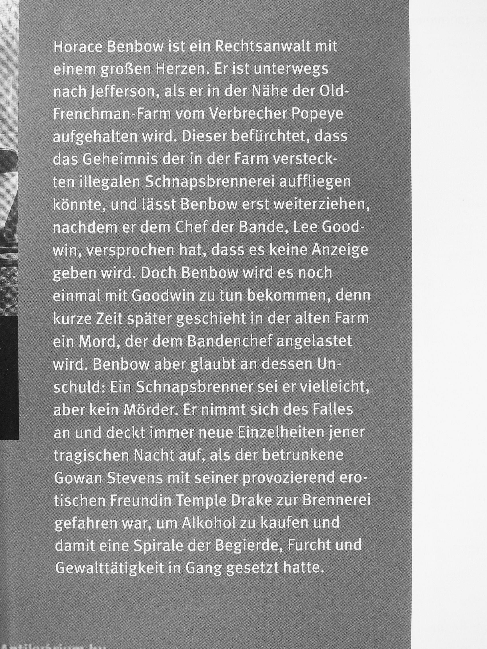 Horace Benbow ist ein Rechtsanwalt mit einem großen Herzen. Er ist unterwegs nach Jefferson, als er in der Nähe der Old-Frenchman-Farm vom Verbrecher Popeye aufgehalten wird. Dieser befürchtet, dass das Geheimnis der in der Farm versteckten illegalen Schnapsbrennerei auffliegen könnte, und lässt Benbow erst weiterziehen, nachdem er dem Chef der Bande, Lee Good-win, versprochen hat, dass es keine Anzeige geben wird. Doch Benbow wird es noch einmal mit Goodwin zu tun bekommen, denn kurze Zeit später geschieht in der alten Farm ein Mord, der dem Bandenchef angelastet wird. Benbow aber glaubt an dessen Unschuld: Ein Schnapsbrenner sei er vielleicht, aber kein Mörder. Er nimmt sich des Falles an und deckt immer neue Einzelheiten jener tragischen Nacht auf, als der betrunkene Gowan Stevens mit seiner provozierend erotischen Freundin Temple Drake zur Brennerei gefahren war, um Alkohol zu kaufen und damit eine Spirale der Begierde, Furcht und Gewalttätigkeit in Gang gesetzt hatte.