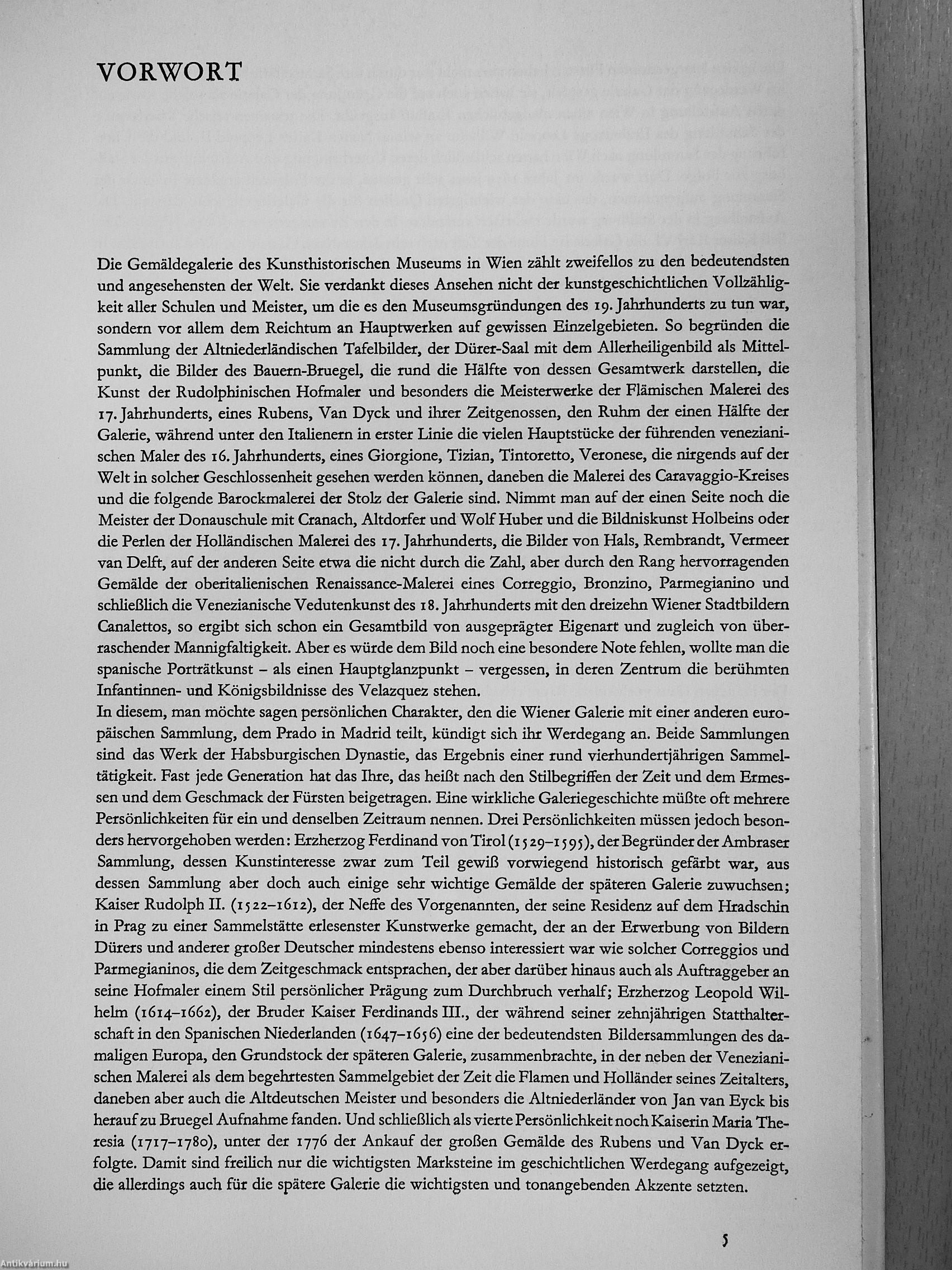Die Gemäldegalerie des Wiener Kunsthistorischen Museums kann an Fülle, Vielseitigkeit und Rang ihrer Bestände nur mit dem Louvre in Paris, der Ermitage in Leningrad, dem Prado in Madrid und der National Gallery in London verglichen werden. Sie enthält hauptsächlich Werke des 16. und 17. Jahrhunderts, während die des 15. und 18. Jahrhunderts eine Art Einstimmung und Ausklang geben. Nicht nur, daß bestimmte berühmte Bilder vereint sind, macht die Eigenart der Wiener Galerie aus, sondern daß solche Kunstwerke im lebendigen Zusammenklang mit ihresgleichen stehen. So offenbart sich zum Beispiel die Malerei des klassischen Jahrhunderts Venedigs nirgends in der Welt so geschlossen, so voll und vielseitig wie hier, ebenso die der Vlamen. Aber auch sonst verfügt diese aus der Sammelleidenschaft des habsburgischen Herrscherhauses erwachsene Sammlung, deren Anfänge ins 16. Jahrhundert zurückreichen, über hervorragende Schätze, etwa an Werken der sogenannten manieristischen Malerei. Einzelne...