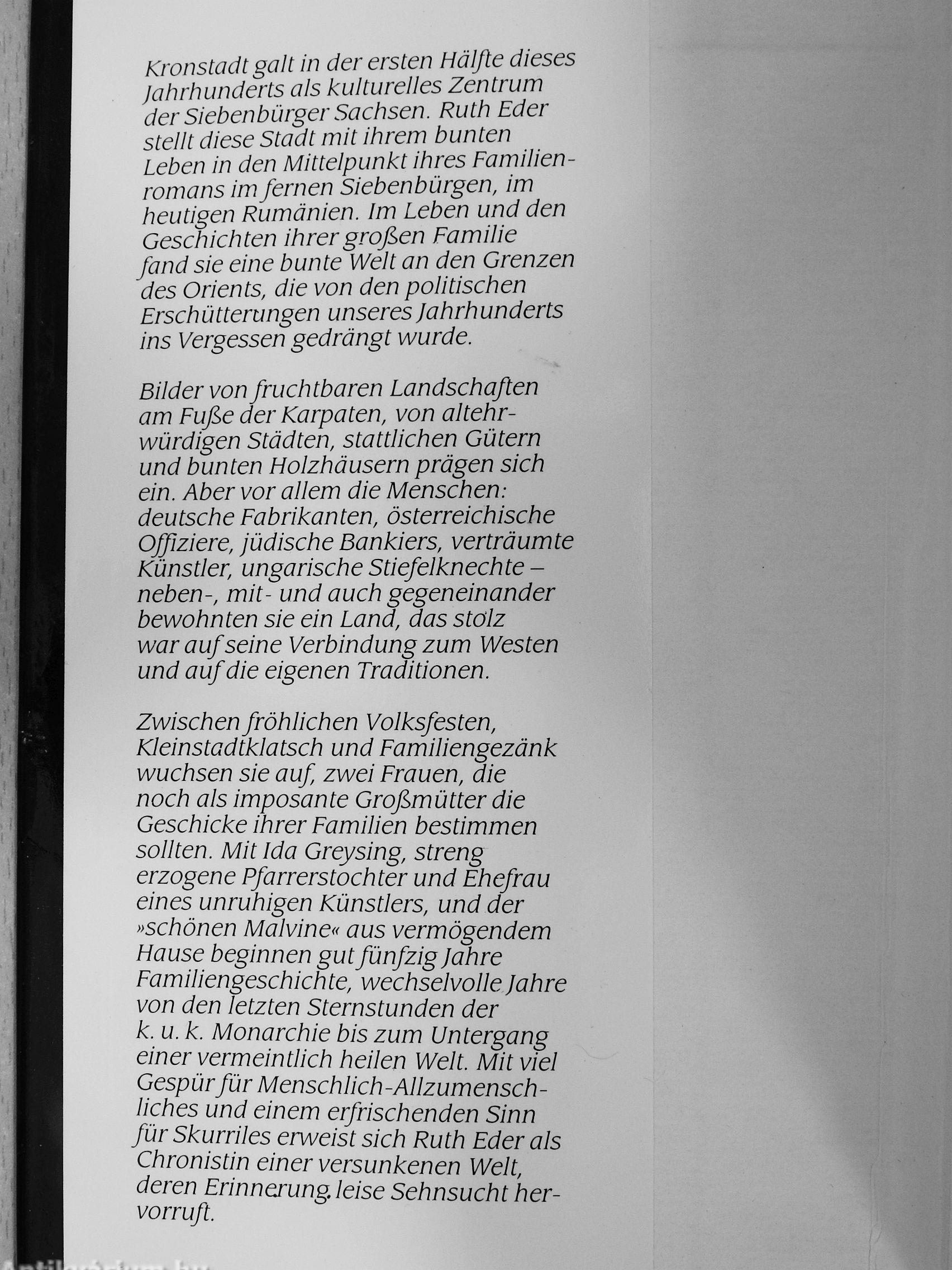 Kronstadt galt in der ersten Hälfie dieses Jahrhunderts als kulturelles Zentrum der Siebenbürger Sachsen. Ruth Eder stellt diese Stadt mit ihrem bunten Leben in den Mittelpunkt ihres Familienromans im fernen Siebenbürgen, im heutigen Rumänien. Im Leben und den Geschichten ihrer großen Familie fand sie eine bunte Welt an den Grenzen des Orients, die von den politischen Erschütterungen unseres Jahrhunderts ins Vergessen gedrängt wurde.