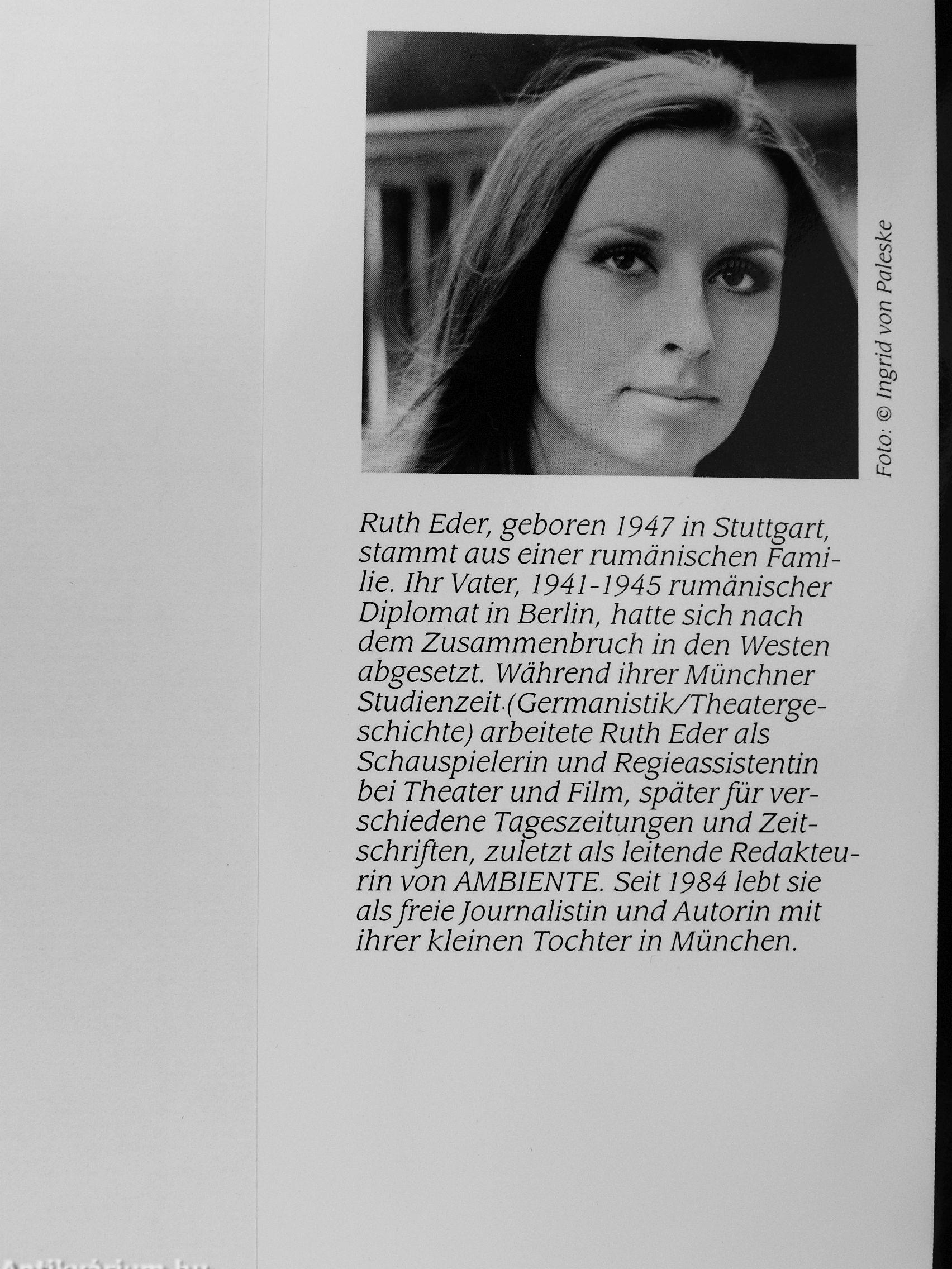 Ruth Eder, geboren 1947 in Stuttgart, stammt aus einer rumänischen Familie. Ihr Vater, 1941-1945 rumänischer Diplomat in Berlin, hatte sich nach dem Zusammenbruch in den Westen abgesetzt. Während ihrer Münchner Studienzeit(Germanistik/Theaterge-schichte) arbeitete Ruth Eder als Schauspielerin und Regieassistentin bei Theater und Film, späterfür verschiedene Tageszeitungen und Zeit-schrißen, zuletzt als leitende Redakteurin von AMBIENTE. Seit 1984 lebt sie als freie Journalistin und Autorin mit ihrer kleinen Tochter in München.