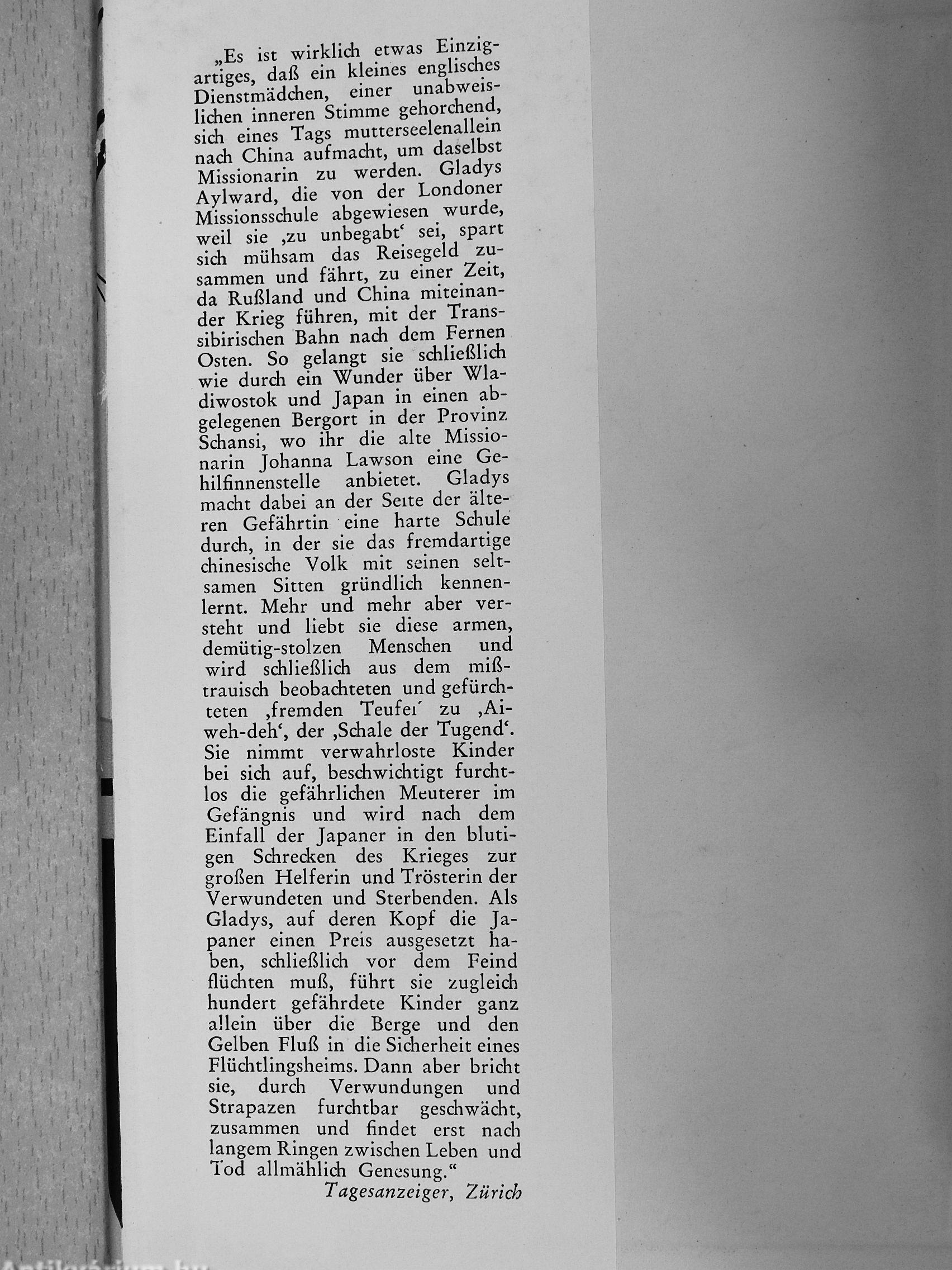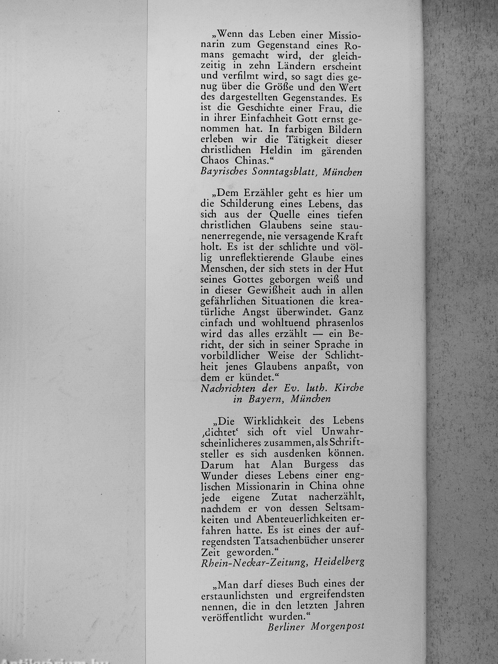 „Die Wirklichkeit des Lebens .dichtet' sich oft viel Unwahrscheinlicheres zusammen, als Schriftsteller es sich ausdenken können. Darum hat Alan Burgess das Wunder dieses Lebens einer englischen Missionarin in China ohne jede eigene Zutat nacherzählt, nachdem er von dessen Seltsamkeiten und Abenteuerlichkeiten erfahren hatte. Es ist eines der aufregendsten Tatsachenbücher unserer Zeit geworden."