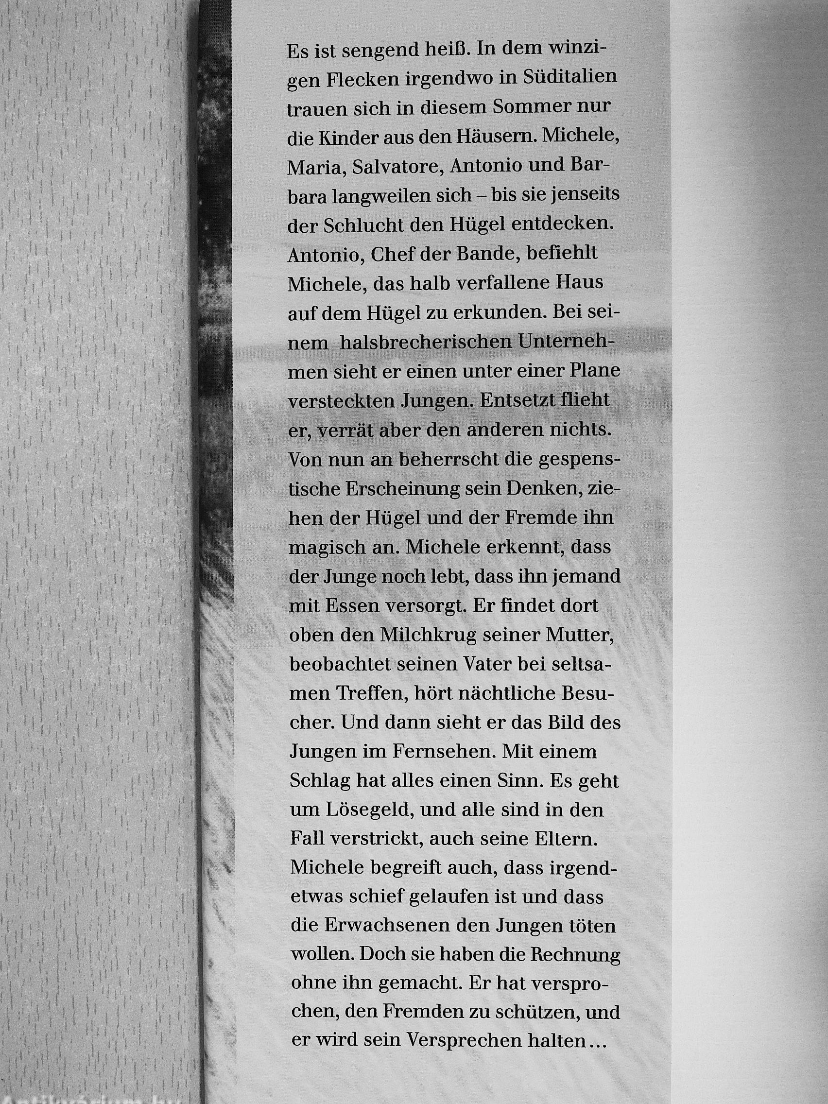 Es ist sengend heiß. In dem winzigen Flecken irgendwo üi Süditalien trauen sich in diesem Sommer nur die Kinder aus den Häusern. Michele, Maria, Salvatore, Antonio und Barbara langweilen sich - bis sie jenseits der Schlucht den Hügel entdecken. Antonio, Chef der Bande, befiehlt Michele, das halb verfallene Haus auf dem Hügel zu erkunden. Bei seinem halsbrecherischen Unternehmen sieht er einen xmter einer Plane versteckten Jungen. Entsetzt flieht er, verrät aber den anderen nichts. Von nun an beherrscht die gespenstische Erscheinung sein Denken, ziehen der Hügel und der Fremde ihn magisch an. Michele erkennt, dass der Junge noch lebt, dass ihn jemand mit Essen versorgt. Er findet dort oben den Milchkrug seiner Mutter, beobachtet seinen Vater bei seltsamen Treffen, hört nächtUche Besucher. Und dann sieht er das Bild des Jungen im Fernsehen. Mit einem Schlag hat alles einen Sinn. Es geht um Lösegeld, und alle sind in den Fall verstrickt, auch seine Eltern. Michele begreift auch, dass irgendetwas schief gelaufen ist und dass die Erwachsenen den Jungen töten wollen. Doch sie haben die Rechnimg ohne ihn gemacht. Er hat versprochen, den Fremden zu schützen, und er wird sein Versprechen halten