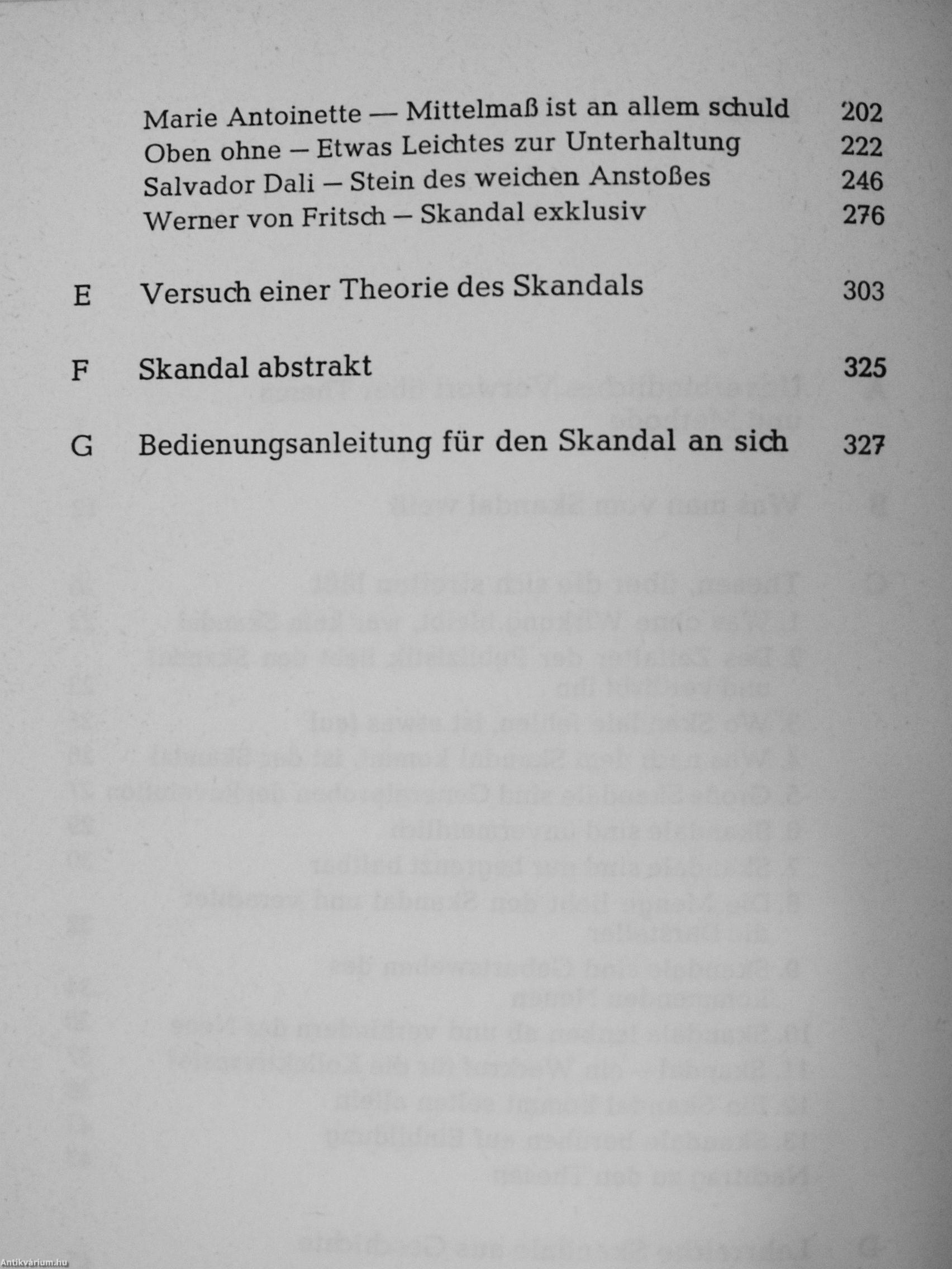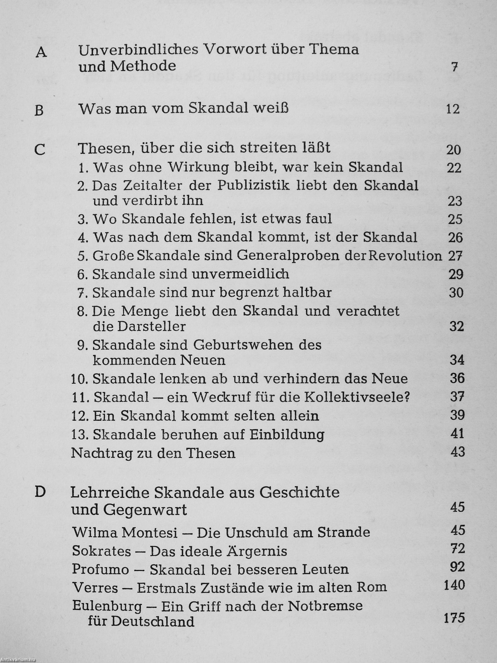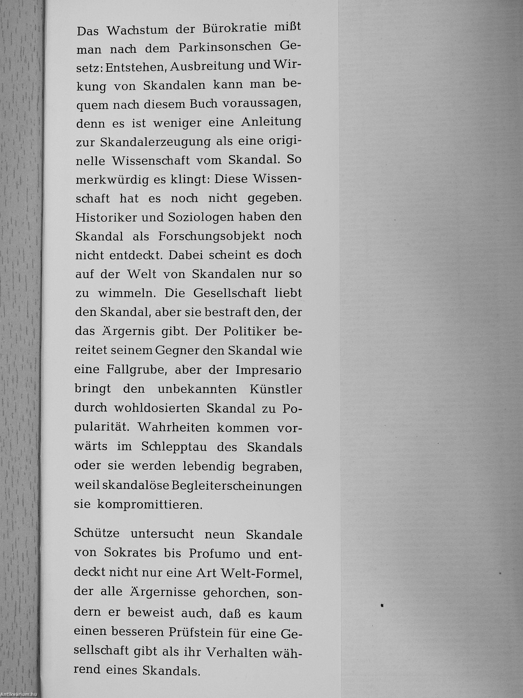Das Wachstum der Bürokratie mißt man nach dem Parkinsonschen Gesetz: Entstehen, Ausbreitung und Wirkung von Skandalen kann man bequem nach diesem Buch voraussagen, denn es ist weniger eine Anleitung zur Skandalerzeugung als eine originelle Wissenschaft vom Skandal. So merkwürdig es klingt: Diese Wissenschaft hat es noch nicht gegeben. Historiker und Soziologen haben den Skandal als Forschungsobjekt noch nicht entdeckt. Dabei scheint es doch auf der Welt von Skandalen nur so zu wimmeln. Die Gesellschaft liebt den Skandal, aber sie bestraft den, der das Ärgernis gibt. Der Politiker bereitet seinem Gegner den Skandal wie eine Fallgrube, aber der Impresario bringt den unbekannten Künstler durch wohldosierten Skandal zu Popularität. Wahrheiten kommen vorwärts im Schlepptau des Skandals oder sie werden lebendig begraben, weil skandalöse Begleiterscheinungen sie kompromittieren.