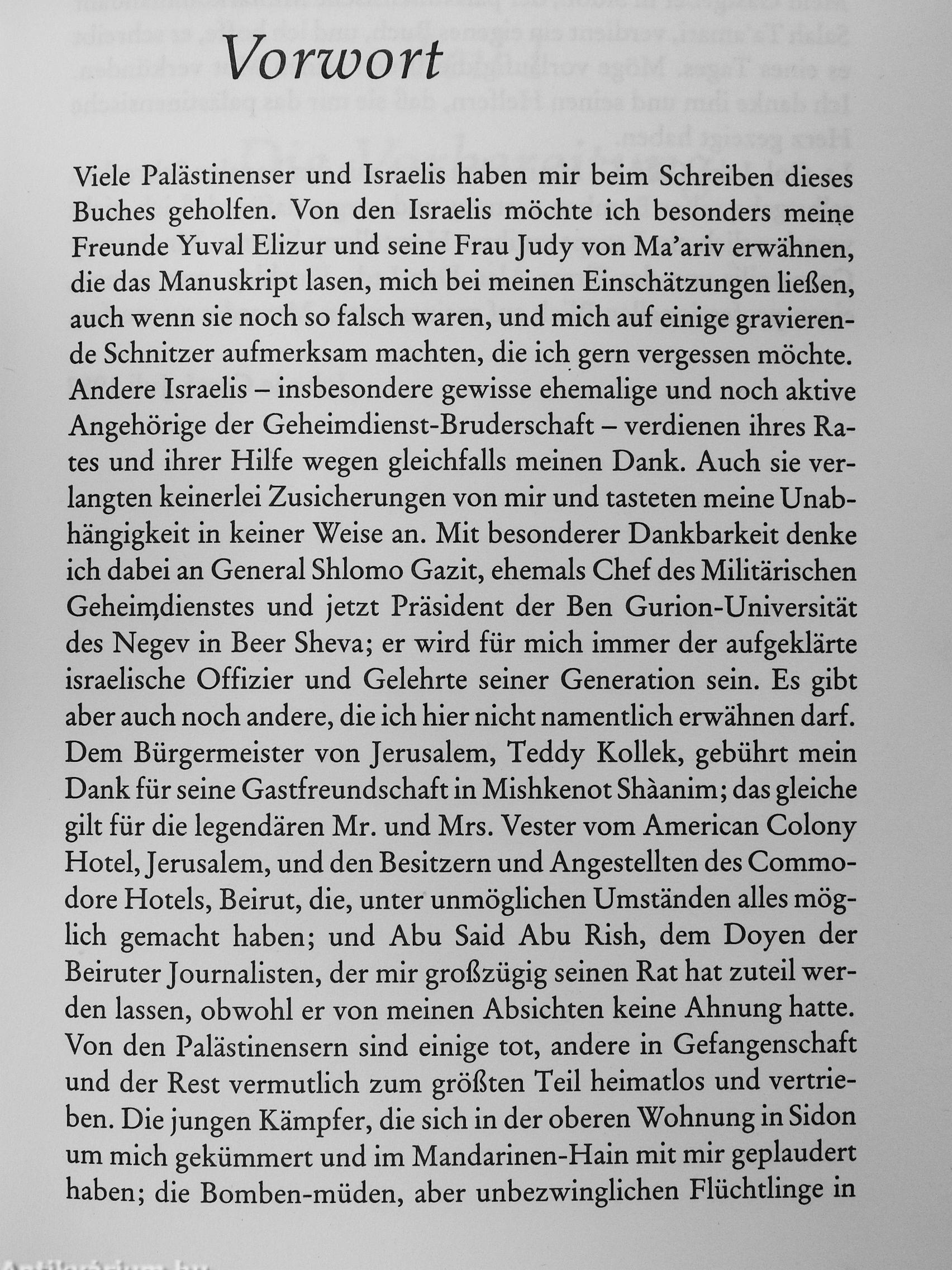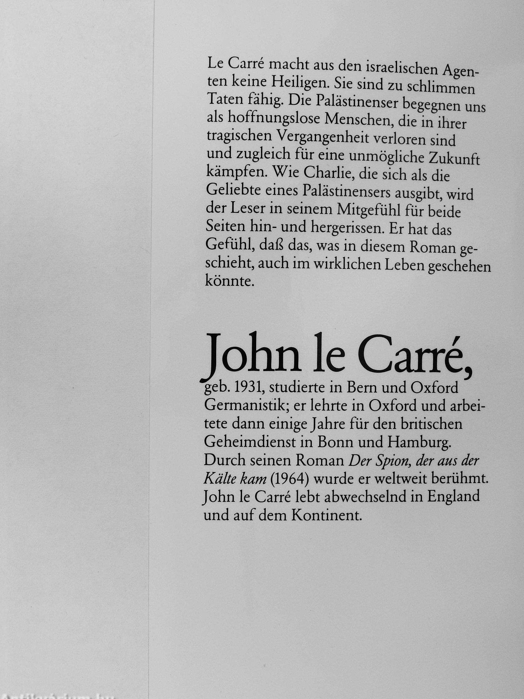 »John le Garres neuer Spioriageroman ist so fesselnd wie 'Der Spion, der aus der Kälte kam' und alles andere, was er geschrieben hat. Er ist so aktuell, daß er aus den Schlagzeilen von morgen stammen könnte. Es geht in ihm um Israel und Palästina. Der Roman beginnt in Bonn, als im Haus eines israelischen Diplomaten eine Bombe hochgeht. Bald darauf erscheint Kurtz auf der Bildfläche, ein israelischer Meister-Spion, der genauso geschickt und trickreich mit Leben und Schicksalen umzugehen weiß wie einst Smiley «
