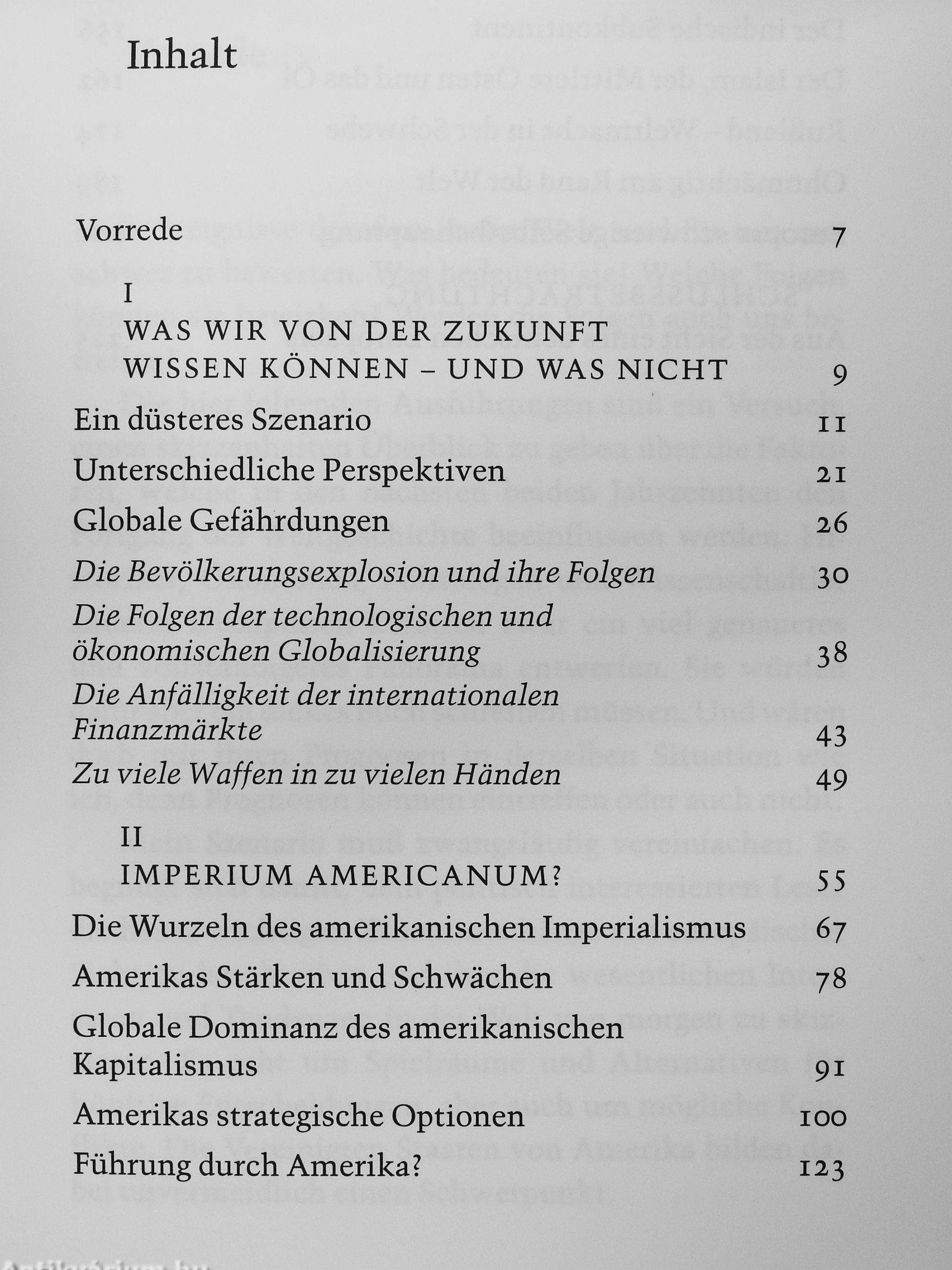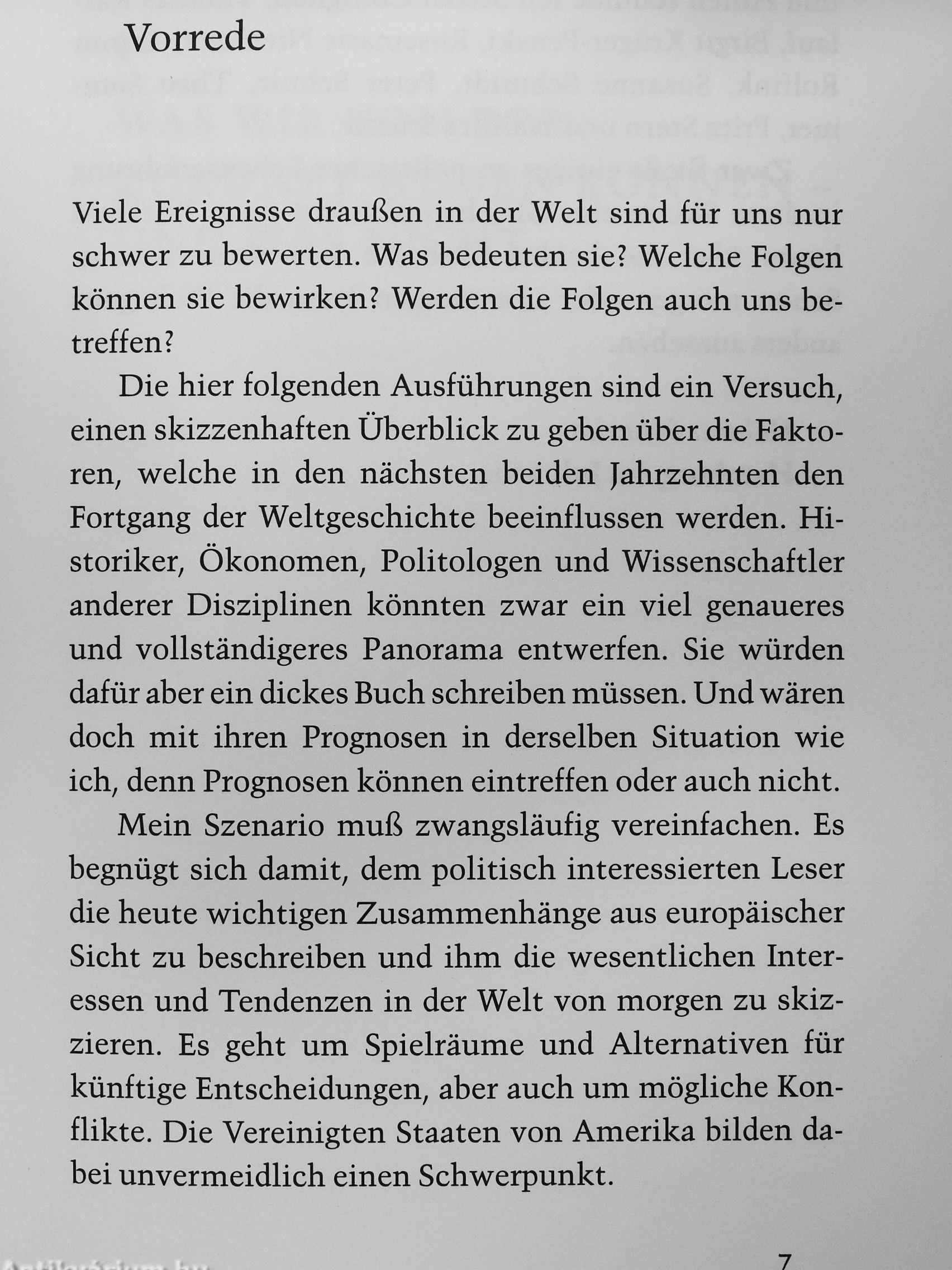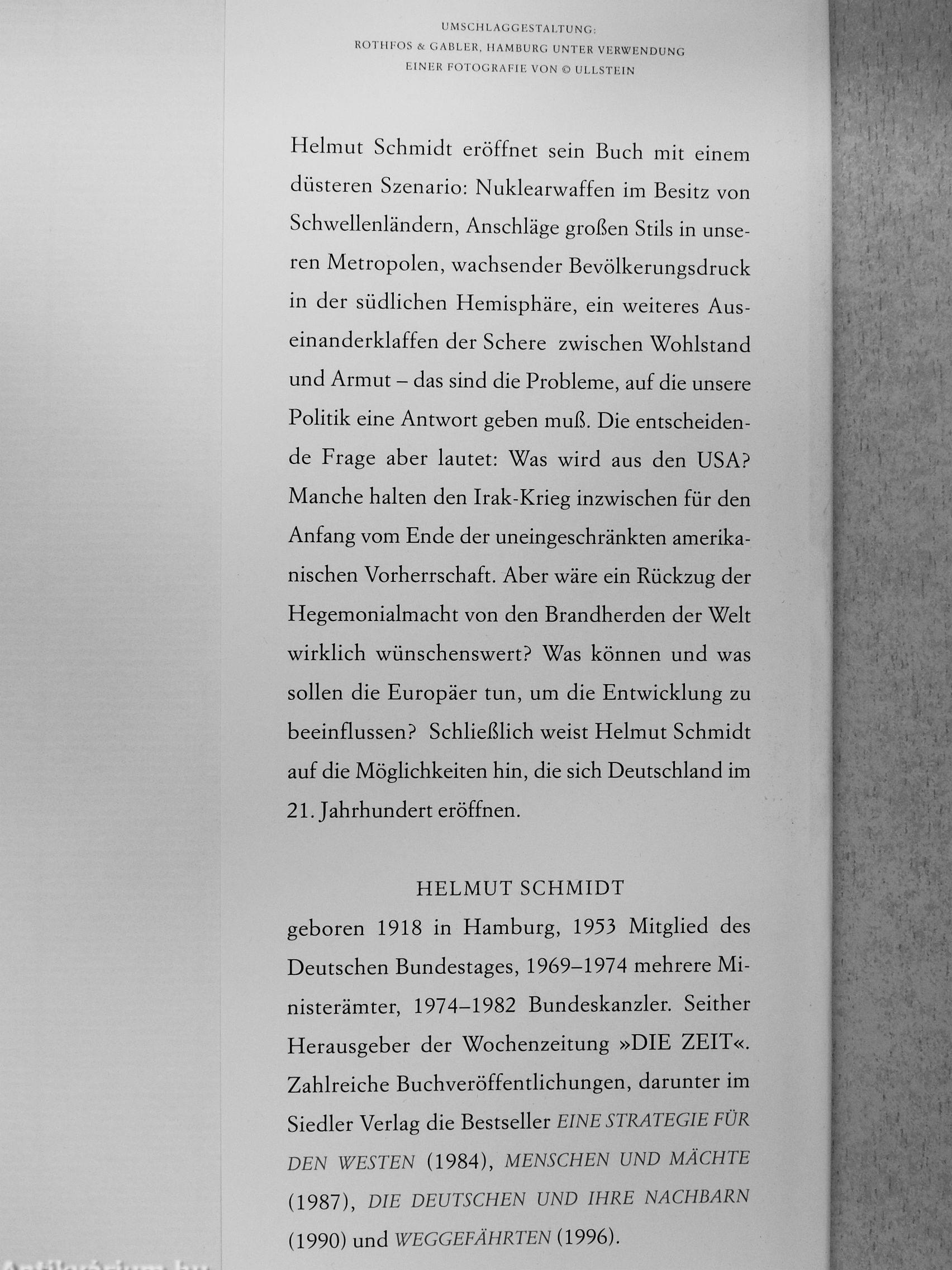 Helmut Schmidt eröffnet sein Buch mit einem düsteren Szenario: Nuklearwaffen im Besitz von Schwellenländern, Anschläge großen Stils in unseren Metropolen, wachsender Bevölkerungsdruck ' in der südlichen Hemisphäre, ein weiteres Aus- i einanderklaffen der Schere zwischen Wohlstand J
