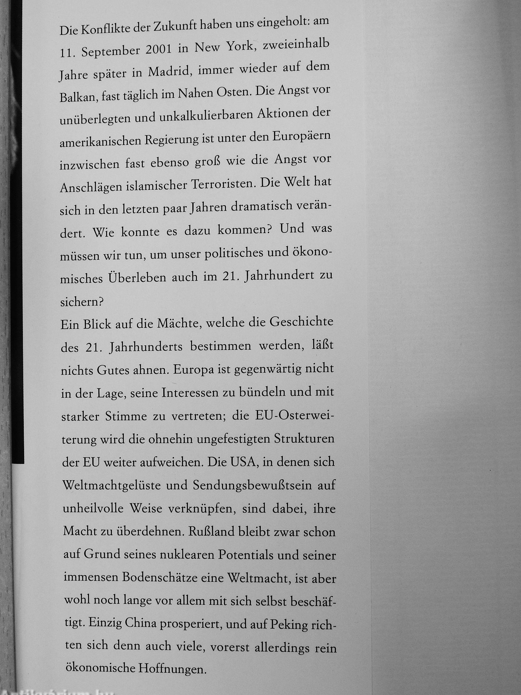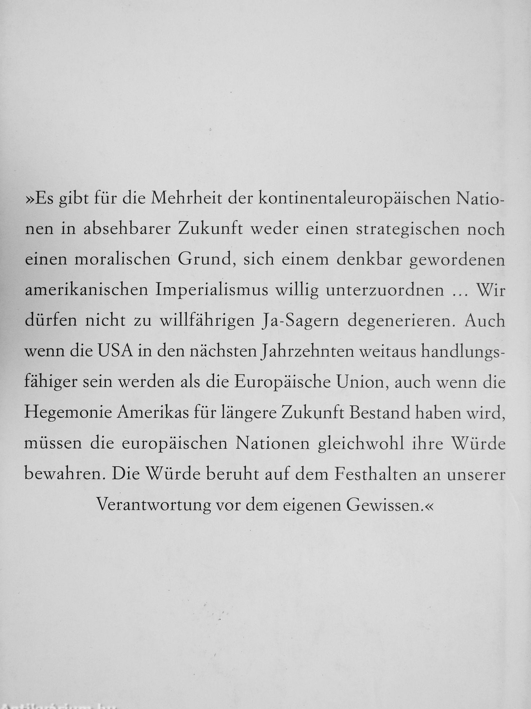 »Es gibt für die Mehrheit der kontinentaleuropäischen Nationen in absehbarer Zukunft weder einen strategischen noch einen moralischen Grund, sich einem denkbar gewordenen amerikanischen Imperialismus willig unterzuordnen Wir dürfen nicht zu willfährigen Ja-Sagern degenerieren. Auch wenn die USA in den nächsten Jahrzehnten weitaus handlungsfähiger sein werden als die Europäische Union, auch wenn die Hegemonie Amerikas für längere Zukunft Bestand haben wird, müssen die europäischen Nationen gleichwohl ihre Würde bewahren. Die Würde beruht auf dem Festhalten an unserer Verantwortung vor dem eigenen Gewissen.«