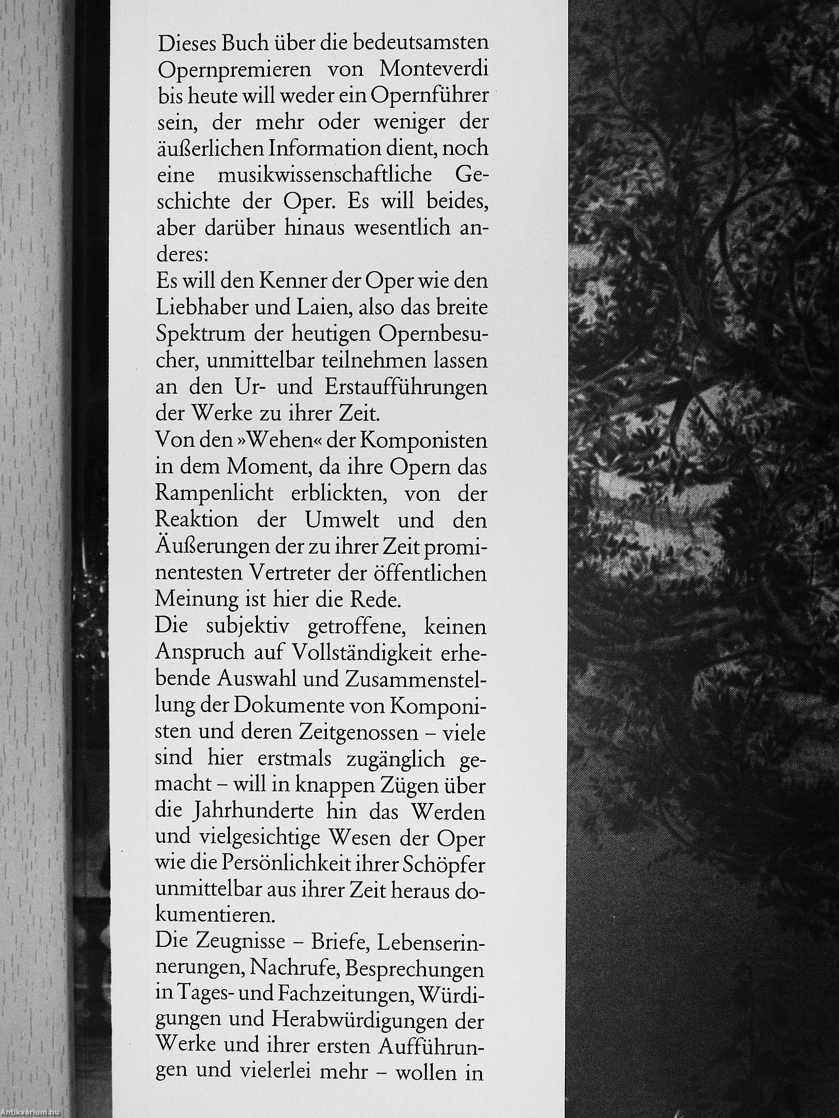 Dieses Buch über die bedeutsamsten Opernpremieren von Monteverdi bis heute will weder ein Opernführer sein, der mehr oder weniger der äußerlichen Information dient, noch eine musikwissenschaftliche Geschichte der Oper. Es will beides, aber darüber hinaus wesendich anderes: