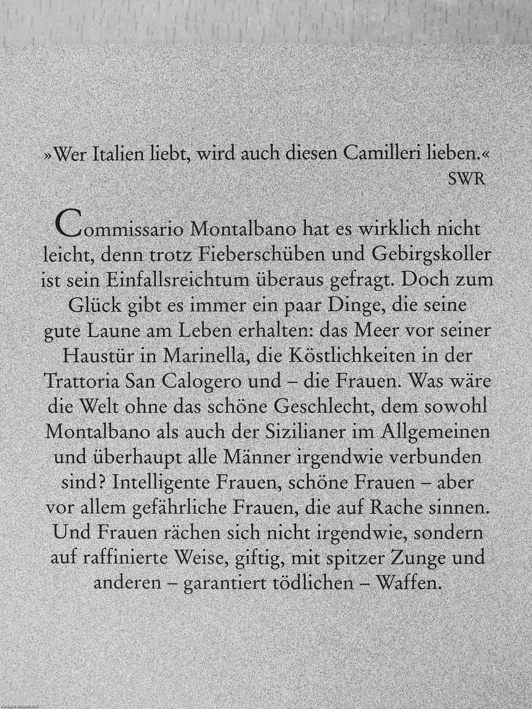 Haustür in Marinella, die Köstlichkeiten in der Trättoria San Calogero und - die Frauen. Was wäre die Welt ohne das schöne Geschlecht, dem sowohl Montalbano als auch der Sizilianer im Allgemeinen und überhaupt alle Männer irgendwie verbunden sind? Intelligeute Frauen, schöne Frauen - aber vor allem gefährliche Frauen, die auf Rache sinnen. Und Frauen rächen sich nicht irgendwie, sondern auf raffinierte Weise, giftig, mit spitzer Zunge und anderen - garantiert tödlichen - Waffen.