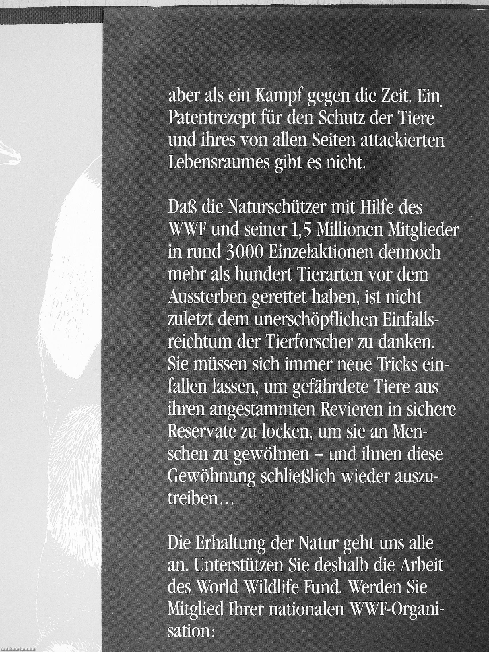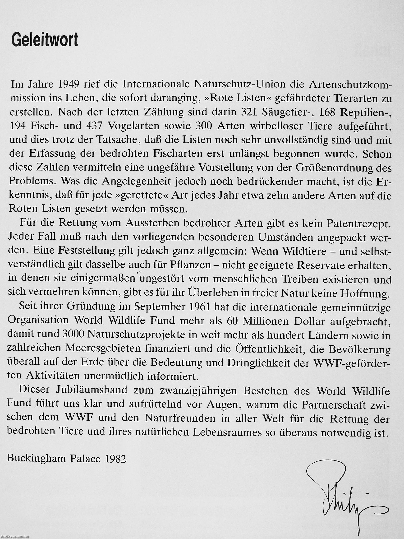 was überall auf der Erde bisher mit Unterstützung des World Wildlife Rmd unternommen wurde, um die lebendige Kette der Evolution von den letzten noch existierenden Urzeittieren bis zur Fauna unserer Zeit nicht plötzlich abreißen zu lassen, das gehört zweifellos zu den größten Pionierleistungen der Naturforschung und des Naturschutzes.