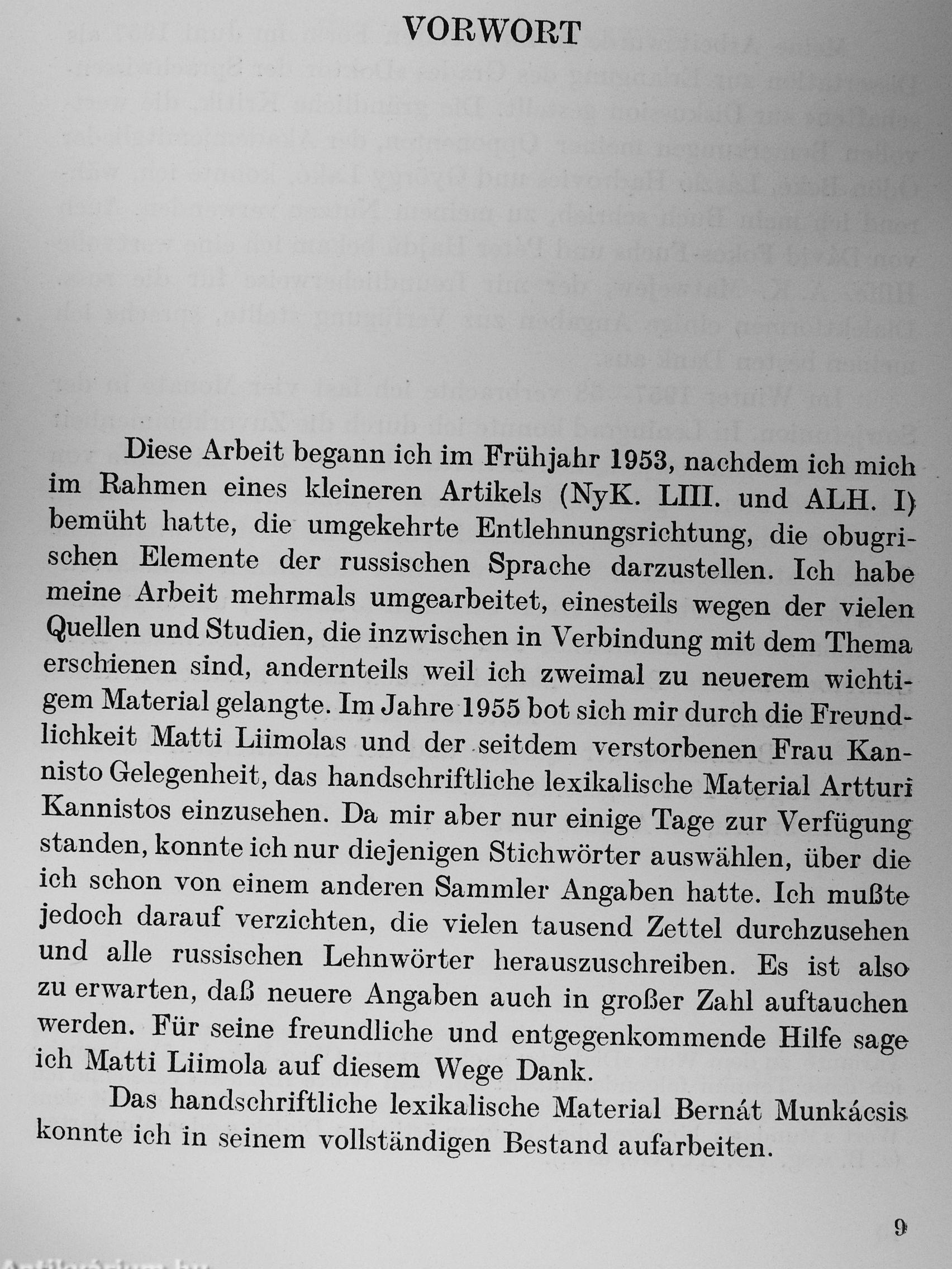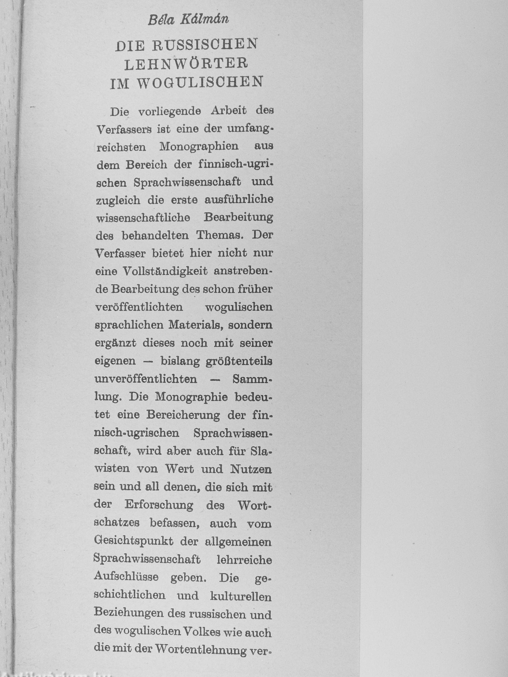 Die vorliegende Arbeit des Verfassers ist eine der umfangreichsten Monographien aus dem Bereich der finnisch-ugrischen Sprachwissenschaft imd zugleich die erste ausführliche wissenschaftliche Bearbeitimg des behandelten Themas. Der Verfasser bietet hier nicht nur eine Vollständigkeit anstrebende Bearbeitung des schon früher veröffentlichten wogulischen sprachlichen Materials, sondern ergänzt dieses noch mit seiner eigenen — bislang größtenteils imveröffentlichten — Sammlung. Die Monographie bedeutet eine Bereicherung der finnisch-ugrischen Sprachwissenschaft, wird aber auch für Sla-wisten von Wert und Nutzen sein imd all denen, die sich mit der Erforschung des Wortschatzes befassen, auch vom Gesichtspunkt der allgemeinen Sprachwissenschaft lehrreiche Aufschlüsse geben. Die geschichtlichen imd kulturellen Beziehungen des russischen und des wogulischen Volkes wie auch die mit der Wortentlehnung ver-