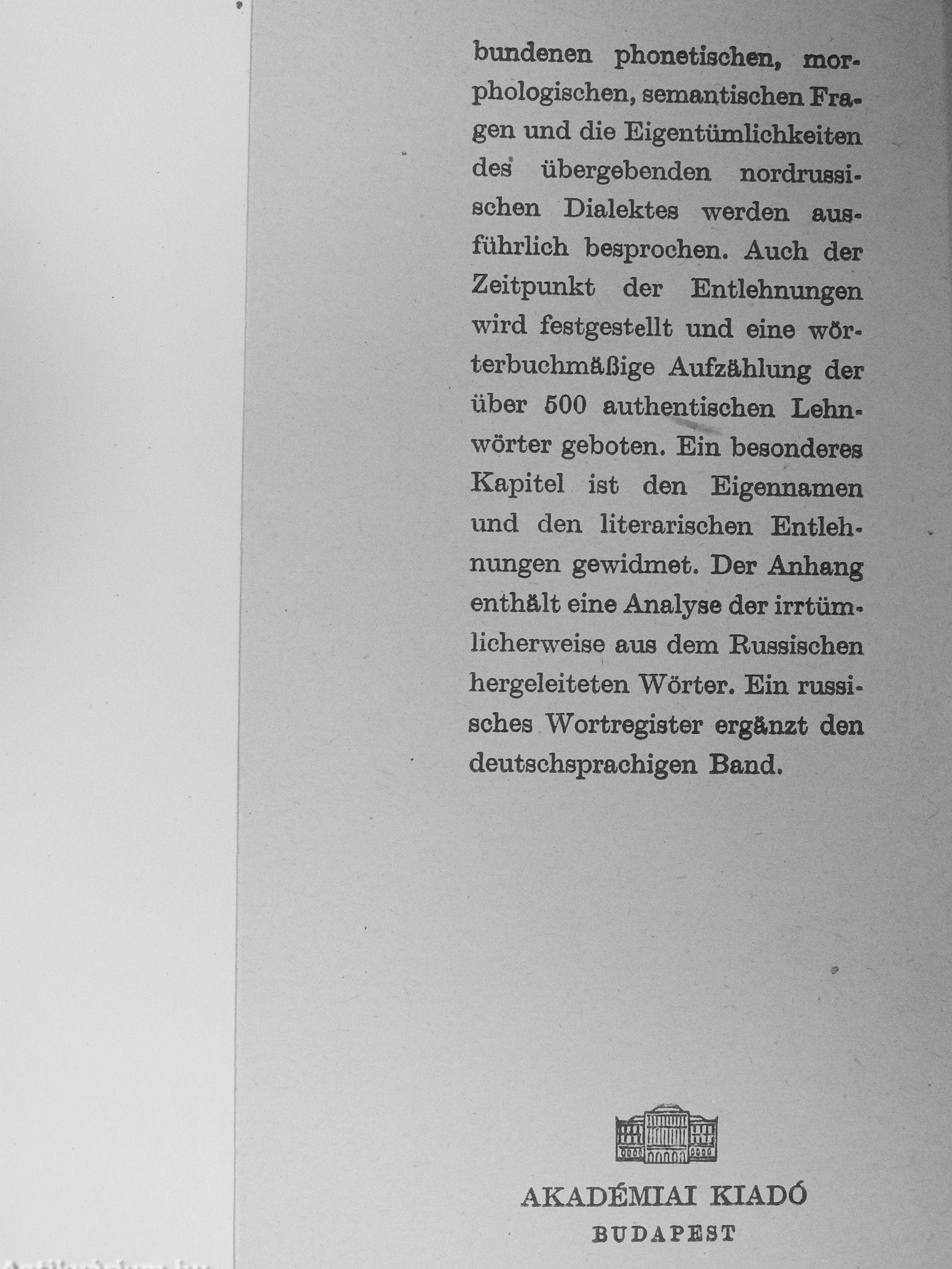 bundenen phonetischen, morphologischen, semantischen Fragen imd die Eigentümlichkeiten des" übergebenden nordnissi-schen Dialektes werden ausführlich besprochen. Auch der Zeitpimkt der Entlehnungen wird festgestellt und eine wörterbuchmäßige Aufzählimg der über 600 authentischen Lehnwörter geboten. Ein besonderes Kapitel ist den Eigennamen und den literarischen Entleh-mmgen gewidmet. Der Anhang enthält eine Analyse der irrtümlicherweise aus dem Russischen hergeleiteten Wörter. Ein russisches Wortregister ergänzt den deutschsprachigen Band.