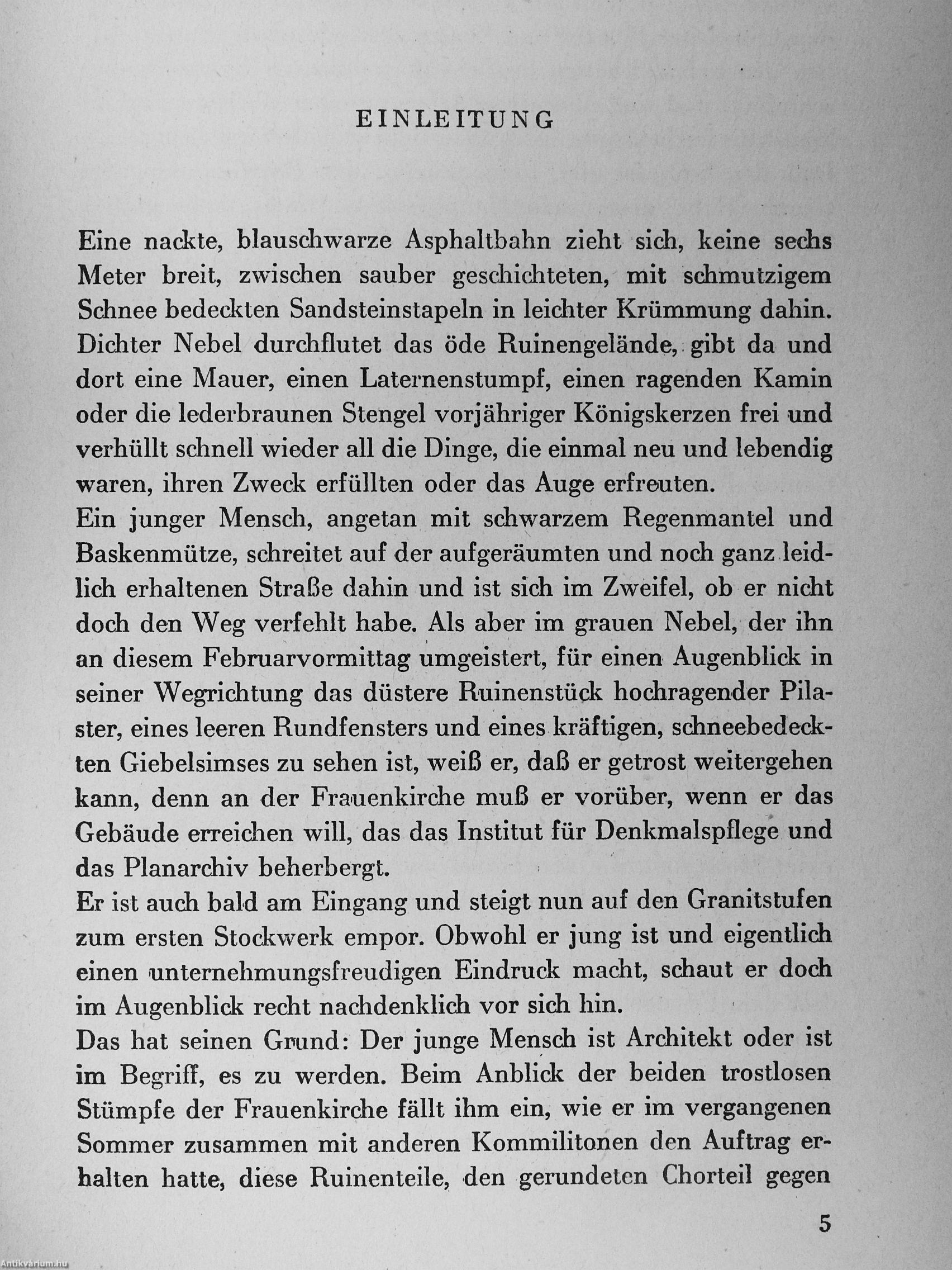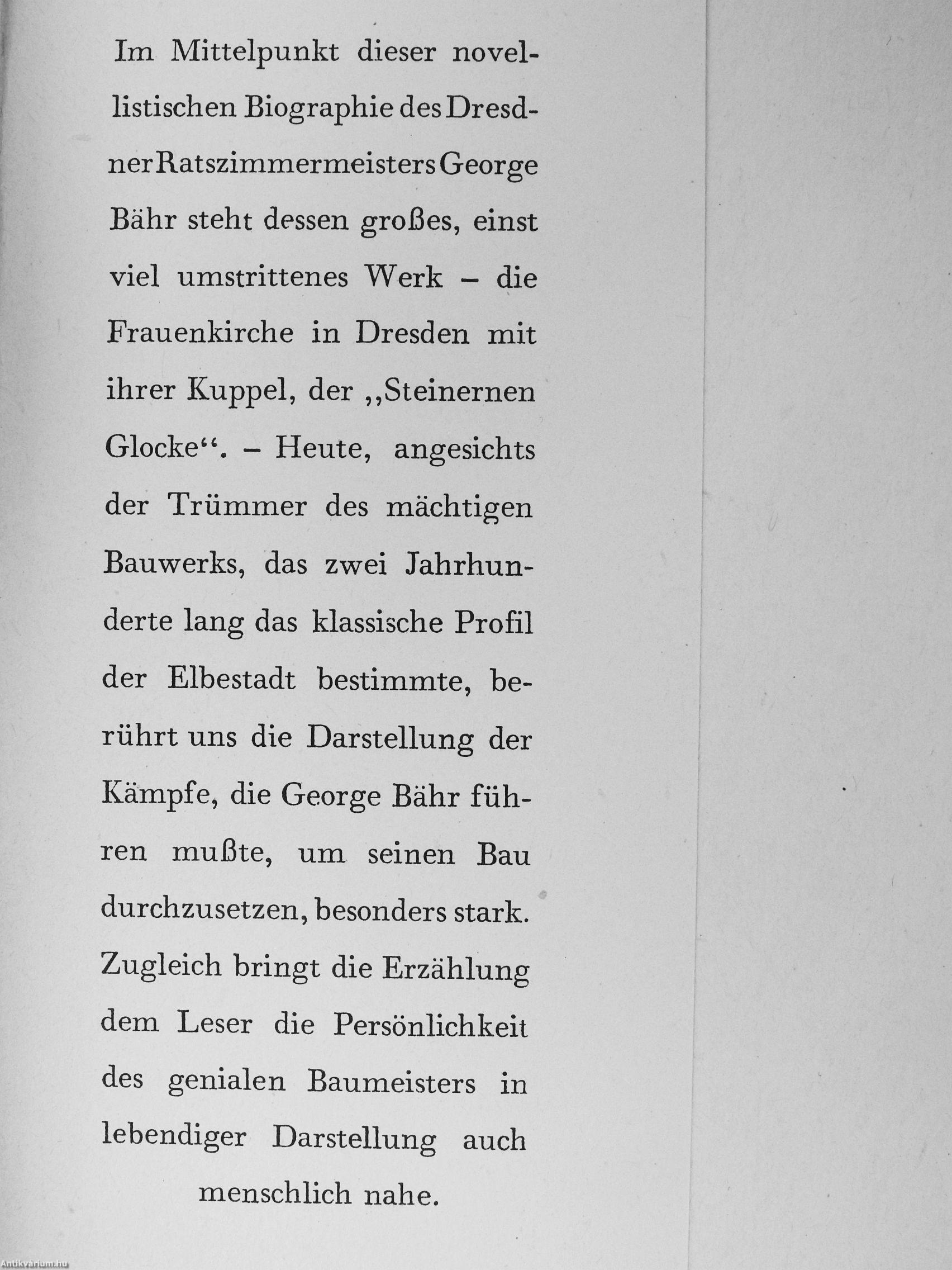 Im Mittelpunkt dieser novellistischen Biographie des Dresdner Ratszimmermeisters George Bahr steht dessen großes, einst viel umstrittenes Werk - die Frauenkirche in Dresden mit ihrer Kuppel, der ,,Steinernen Glocke". - Heute, angesichts der Trümmer des mächtigen Bauvi^erks, das zwei Jahrhunderte lang das klassische Profil der Elbestadt bestimmte, berührt uns die Darstellung der Kämpfe, die George Bähr führen mußte, um seinen Bau durchzusetzen, besonders stark. Zugleich bringt die Erzählung dem Leser die Persönlichkeit des genialen Baumeisters in lebendiger Darstellung auch menschlich nahe.