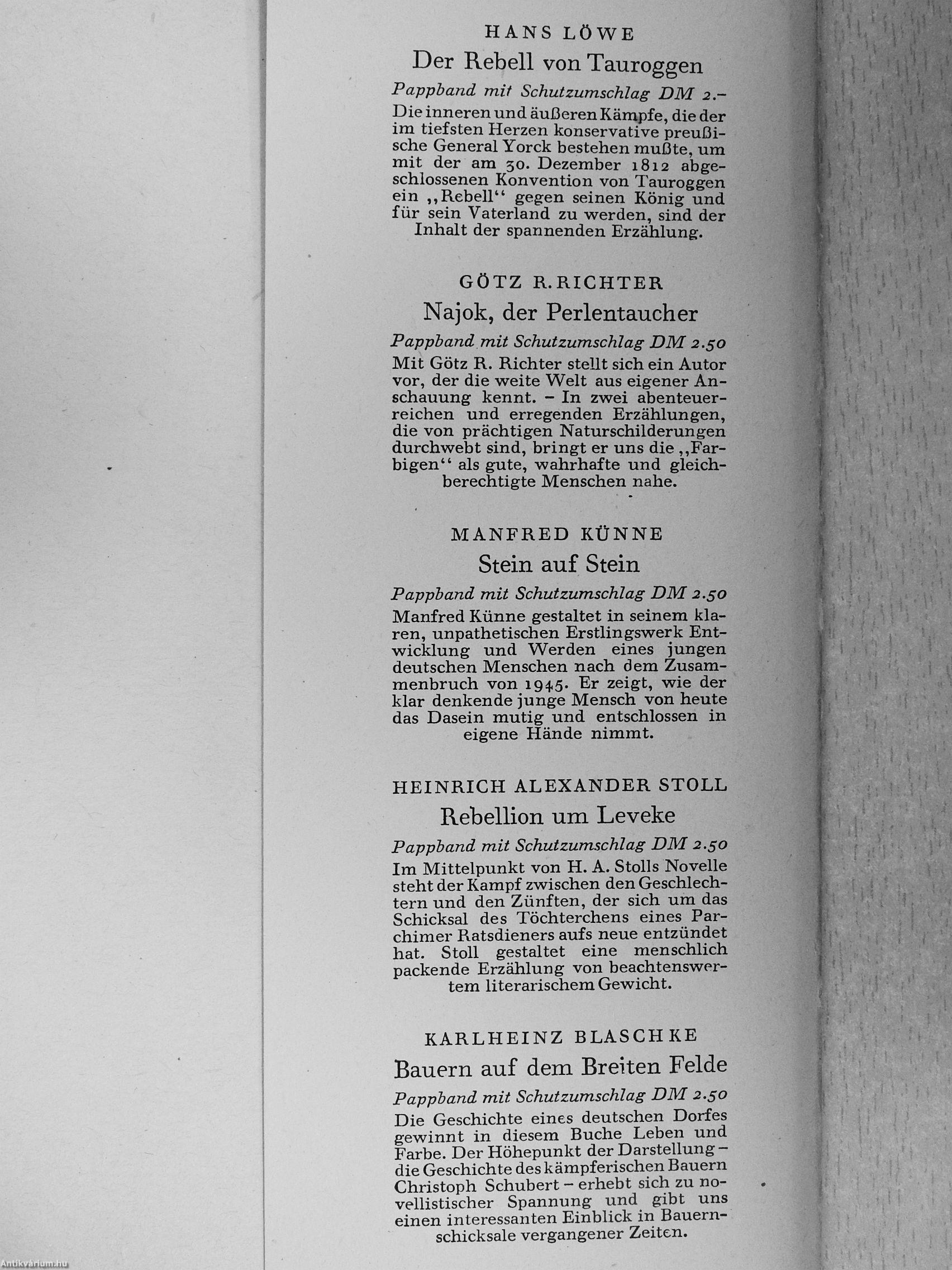 Papphand mit Schutzumschlag DM 2.50 Manfred Künne gestaltet in seinem klaren, unpathetischen Erstlingswerk Entwicklung und Werden eines jungen deutschen Menschen nach dem Zusammenbruch von 194.5. zeigt, wie der klar denkende junge Mensch von heute das Dasein mutig und entschlossen in eigene Hände nimmt.