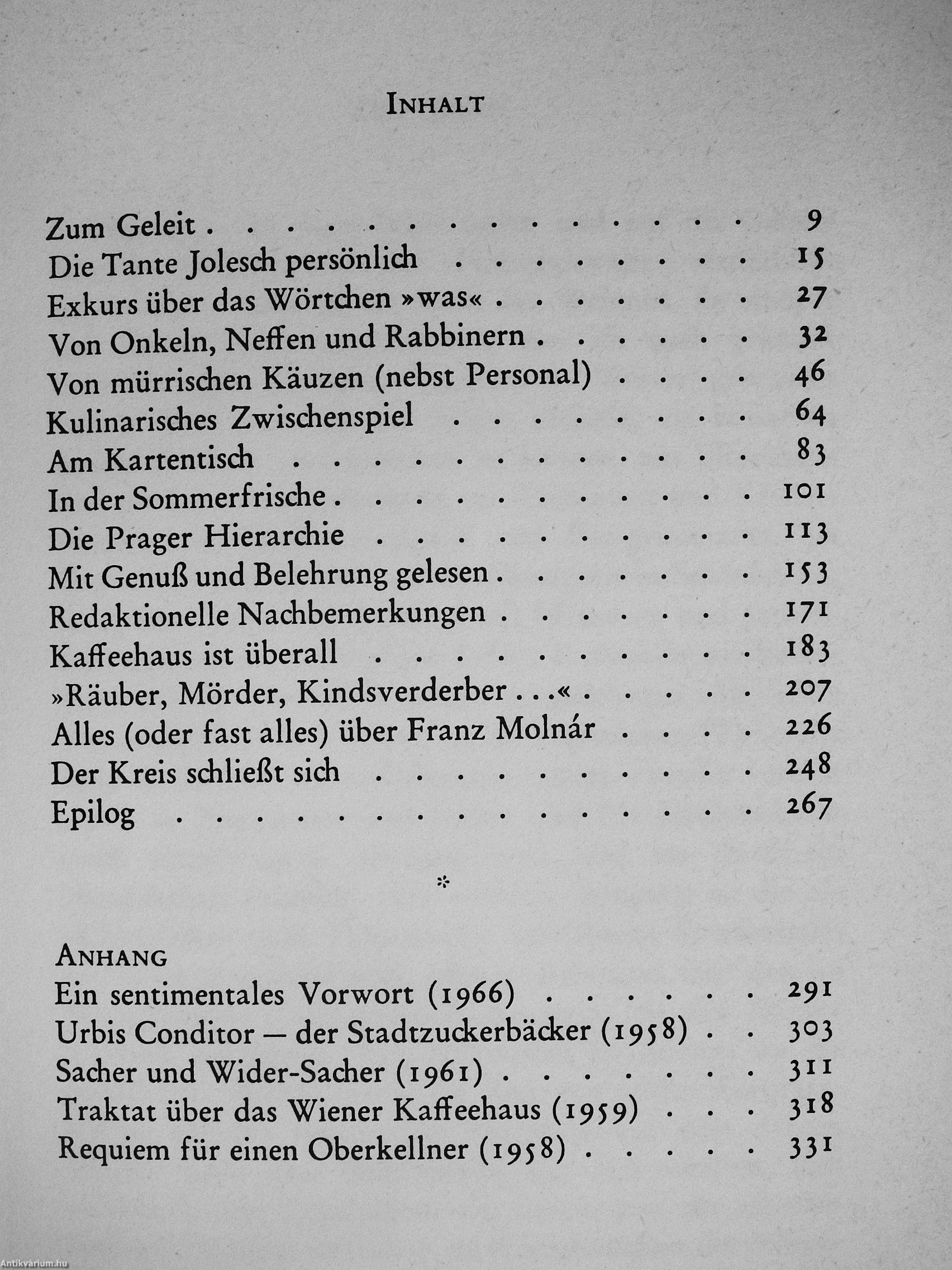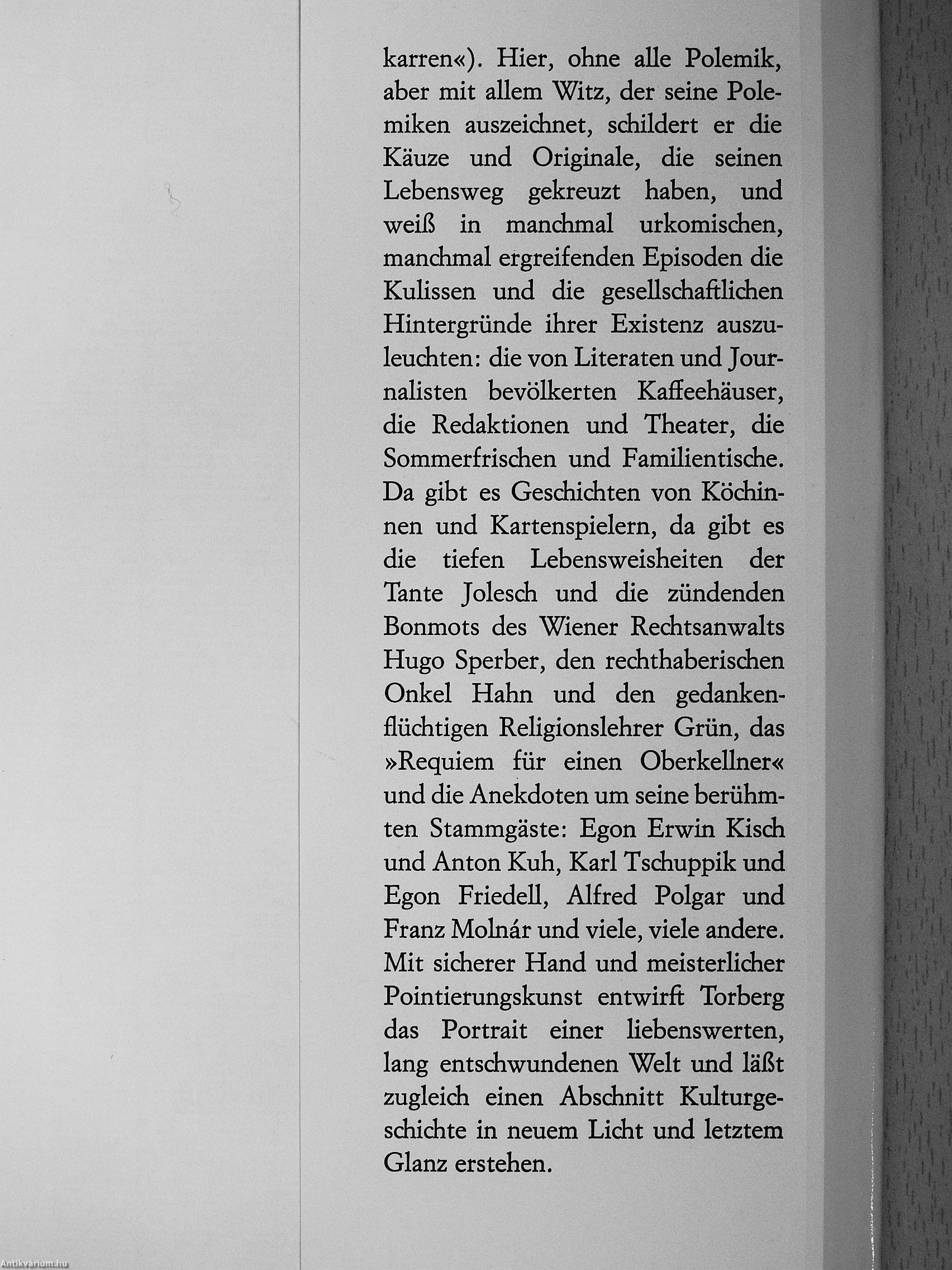 karren«). Hier, ohne alle Polemik, aber mit allem Witz, der seine Polemiken auszeichnet, schildert er die Käuze und Originale, die seinen Lebensweg gekreuzt haben, und weiß in manchmal urkomischen, manchmal ergreifenden Episoden die Kulissen und die gesellschaftlichen Hintergründe ihrer Existenz auszuleuchten: die von Literaten und Journalisten bevölkerten Kaffeehäuser, die Redaktionen und Theater, die Sommerfrischen und FamÜientisdie. Da gibt es Geschiditen von Köchia-nen und Kartenspielern, da gibt es die tiefen Lebensweisheiten der Tante Jolesch und die zündenden Bonmots des Wiener Rechtsanwalts Hugo Sperber, den rechthaberischen Onkel Hahn und den gedankenflüchtigen Religionslehrer Grün, das »Requiem für einen Oberkellner« und die Anekdoten um seine berühmten Stammgäste: Egon Erwin Kisch und Anton Kuh, Karl Tschuppik und Egon Friedeil, Alfred Polgar und Franz Molnár vmd viele, viele andere. Mit sicherer Hand und meisterlicher Pointierungskunst entwirft Torberg das Portrait einer liebenswerten, lang entschwimdenen Welt imd läßt zugleich einen Abschnitt Kulturgeschichte in neuem Licht und letztem Glanz erstehen.