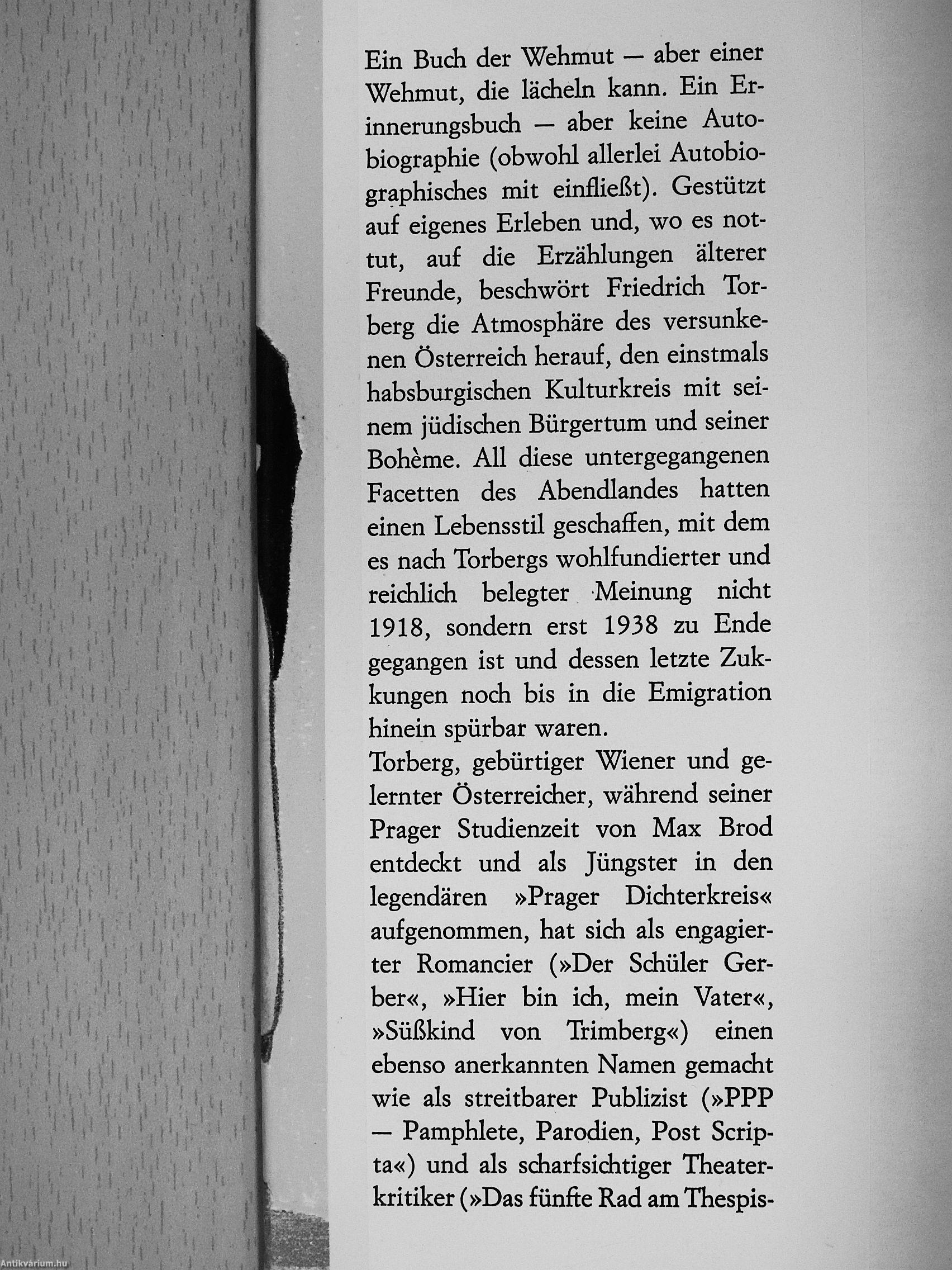 Ein Buch der Wehmut — aber einer Wehmut, die lädieb kann. Ein Erinnerungsbuch — aber keine Autobiographie (obwohl allerlei Autobiographisches mit einfließt). Gestützt auf eigenes Erleben und, wo es nottut, auf die Erzählungen älterer Freunde, beschwört Friedrich Torberg die Atmosphäre des versunkenen Österreich herauf, den einstmals habsburgischen Kulturkreis mit seinem jüdischen Bürgertum und seiner Boheme. All diese untergegangenen Facetten des Abendlandes hatten einen Lebensstil geschaffen, mit dem es nach Torbergs wohlfundierter und reichlich belegter Meinung nicht 1918, sondern erst 1938 zu Ende gegangen ist tmd dessen letzte Zuk-kungen noch bis in die Emigration hinein spürbar waren. Torberg, gebürtiger Wiener und gelernter Österreidier, während seiner Prager Studienzeit von Max Brod entdeckt und als Jüngster in den legendären »Prager Dichterkreis« aufgenommen, hat sich als engagierter Romancier (»Der Schüler Gerber«, »Hier bin ich, mein Vater«, »Süßkind von Trimberg«) einen ebenso anerkannten Namen gemacht wie als streitbarer Publizist (»PPP — Pamphlete, Parodien, Post Scripta«) und als sdiarfsichtiger Theaterkritiker (»Das fünfte Rad am Thespis-