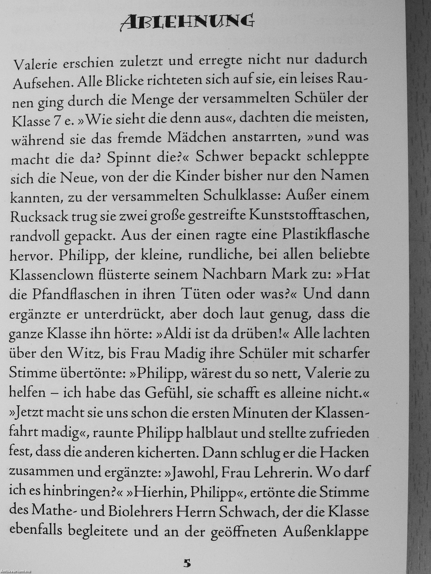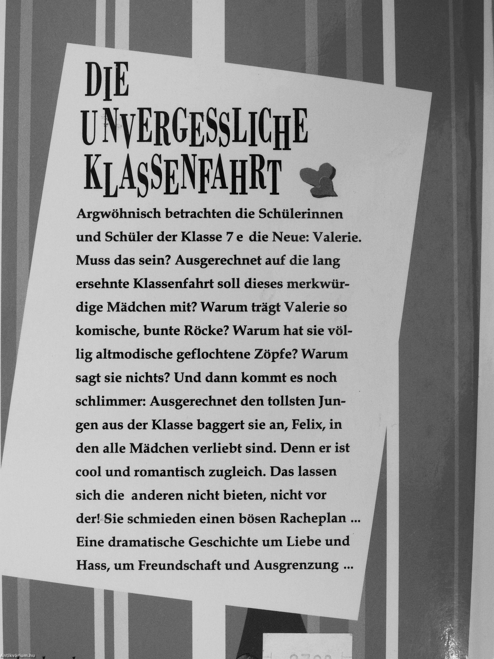 Argwöhnisch betrachten die Schülerinnen und Schüler der Klasse 7 e die Neue: Valerie. Muss das sein? Ausgerechnet auf die lang ersehnte Klassenfahrt soll dieses merkwürdige Mädchen mit? Warum trägt Valerie so komische, bunte Röcke? Warum hat sie völlig altmodische geflochtene Zöpfe? Warum sagt sie nichts? Und dann kommt es noch schlimmer: Ausgerechnet den tollsten Jungen aus der Klasse baggert sie an, Felix, in den alle Mädchen verliebt sind. Denn er ist cool und romantisch zugleich. Das lassen sich die anderen nicht bieten, nicht vor der! Sie schmieden einen bösen Racheplan Eine dramatische Geschichte um Liebe und Hass, um Freundschaft und Ausgrenzung