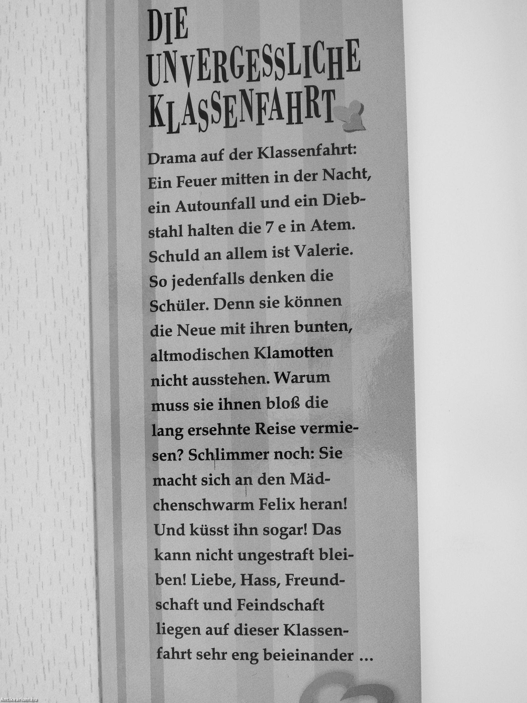 Drama auf der Klassenfahrt: Ein Feuer mitten in der Nacht, ein Autounfall und ein Diebstahl halten die 7 e in Atem. Schuld an allem ist Valerie. So jedenfalls denken die Schüler. Denn sie können die Neue mit ihren bunten, altmodischen Klamotten nicht ausstehen. Warum muss sie ihnen bloß die lang ersehnte Reise vermiesen? Sch^limmer noch: Sie macht sich an den Mäd-chenschwarm Felix heran! Und küsst ihn sogar! Das kann nicht ungestraft bleiben! Liebe, Hass, Freundschaft und Feindschaft liegen auf dieser Klassenfahrt sehr eng beieinander