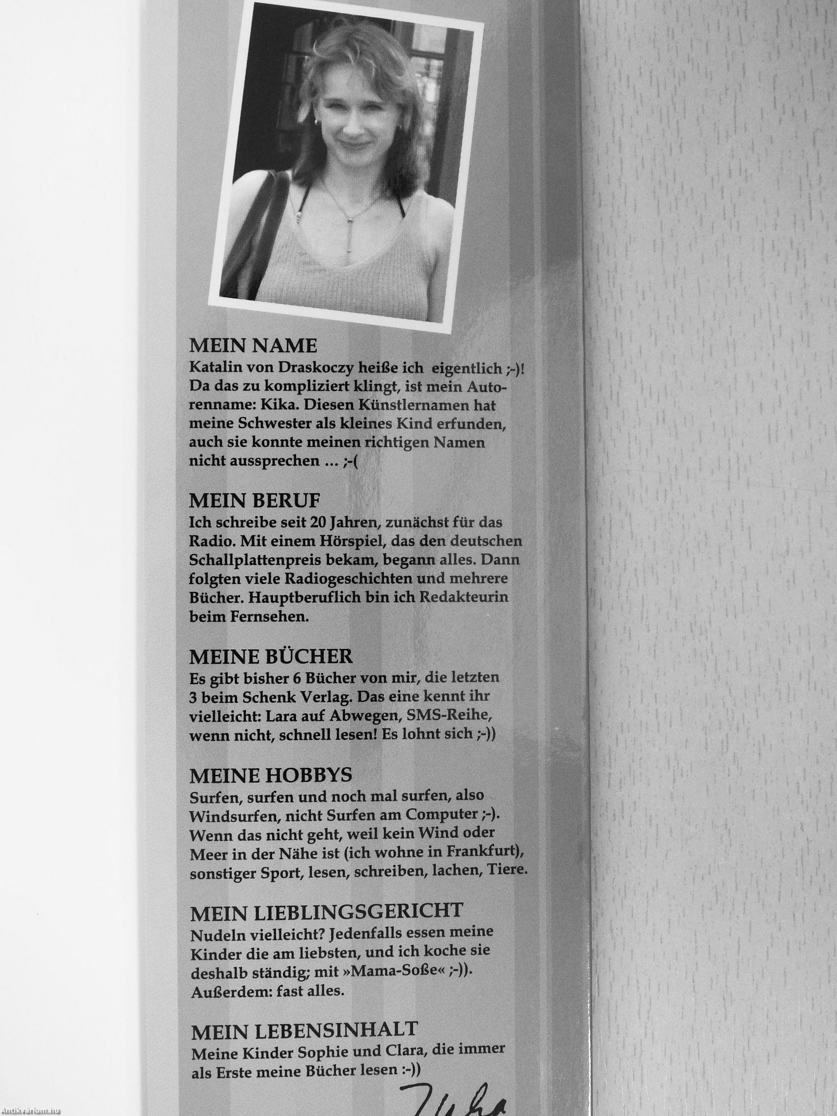 Katalin von Draskoczy heiße ich eigentlich;-)! Da das zu kompliziert klingt, ist mein Autorenname: Kika. Diesen Künstlernamen hat meine Schwester als kleines Kind erfunden, auch sie konnte meinen richtigen Namen nicht aussprechen ;-(