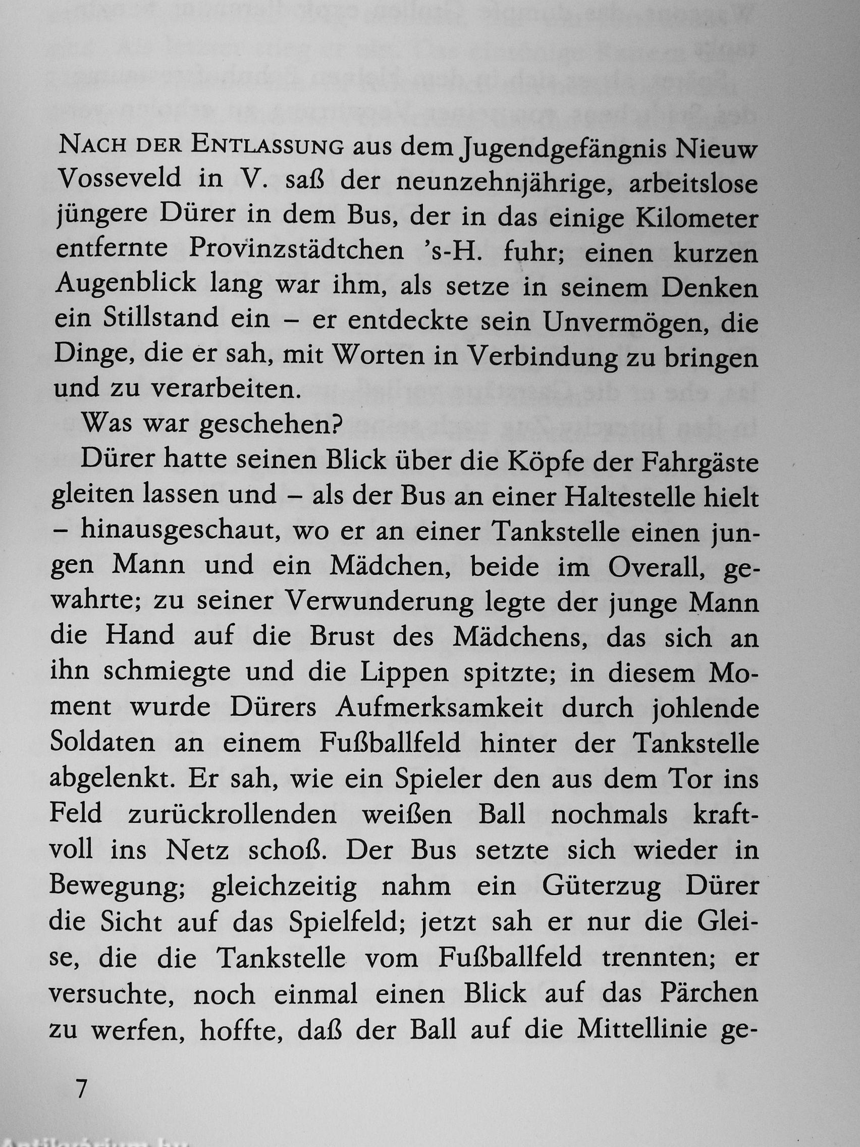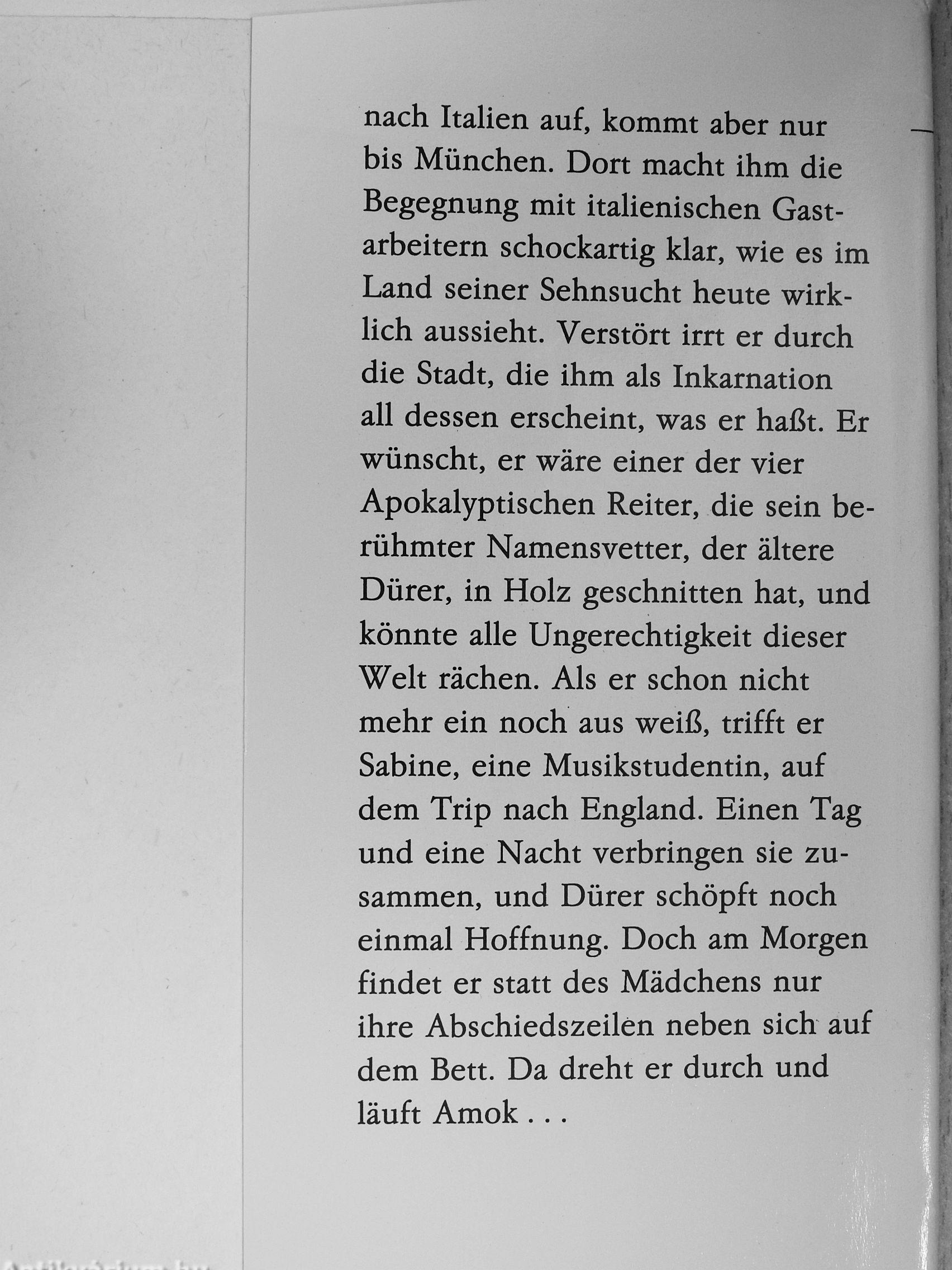 nach Italien auf, kommt aber nur bis München. Dort macht ihm die Begegnung mit italienischen Gastarbeitern schockartig klar, wie es im Land seiner Sehnsucht heute wirklich aussieht. Verstört irrt er durch die Stadt, die ihm als Inkarnation all dessen erscheint, was er haßt. Er wünscht, er wäre einer der vier Apokalyptischen Reiter, die sein berühmter Namensvetter, der ältere Dürer, in Holz geschnitten hat, und könnte alle Ungerechtigkeit dieser Welt rächen. Als er schon nicht mehr ein noch aus weiß, trifft er Sabine, eine Musikstudentin, auf dem Trip nach England. Einen Tag und eine Nacht verbringen sie zusammen, und Dürer schöpft noch einmal Hoffnung. Doch am Morgen findet er statt des Mädchens nur ihre Abschiedszeilen neben sich auf dem Bett. Da dreht er durch und läuft Amok .