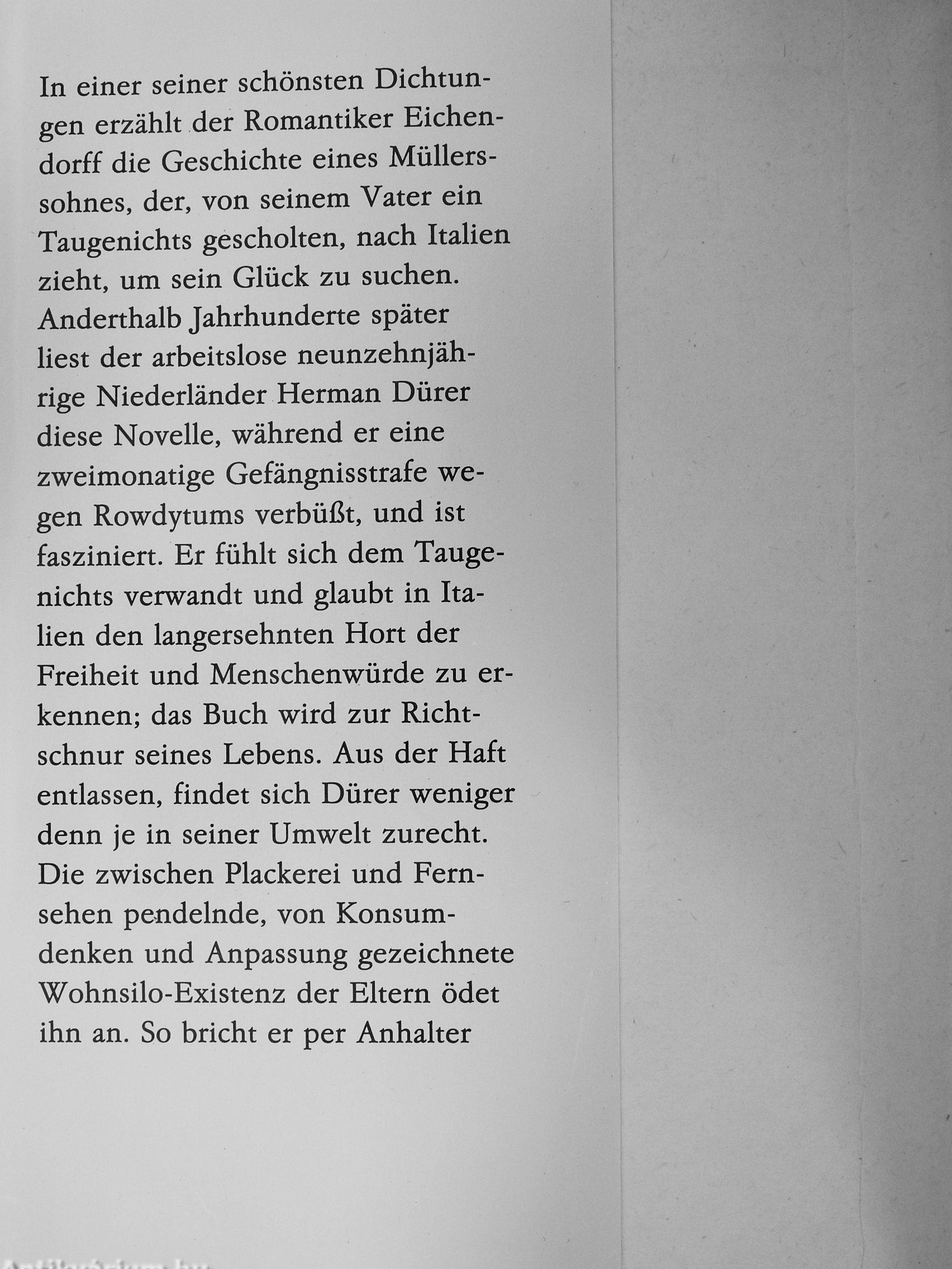 In einer seiner schönsten Dichtungen erzählt der Romantiker Eichendorff die Geschichte eines Müllerssohnes, der, von seinem Vater ein Taugenichts gescholten, nach Italien zieht, um sein Glück zu suchen. Anderthalb Jahrhunderte später liest der arbeitslose neunzehnjährige Niederländer Herman Dürer diese Novelle, während er eine zweimonatige Gefängnisstrafe wegen Rowdytums verbüßt, und ist fasziniert. Er fühlt sich dem Taugenichts verwandt und glaubt in Italien den langersehnten Hort der Freiheit und Menschenwürde zu erkennen; das Buch wird zur Richtschnur seines Lebens. Aus der Haft entlassen, findet sich Dürer weniger denn je in seiner Umwelt zurecht. Die zwischen Plackerei und Fernsehen pendelnde, von Konsumdenken und Anpassung gezeichnete Wohnsilo-Existenz der Eltern ödet ihn an. So bricht er per Anhalter