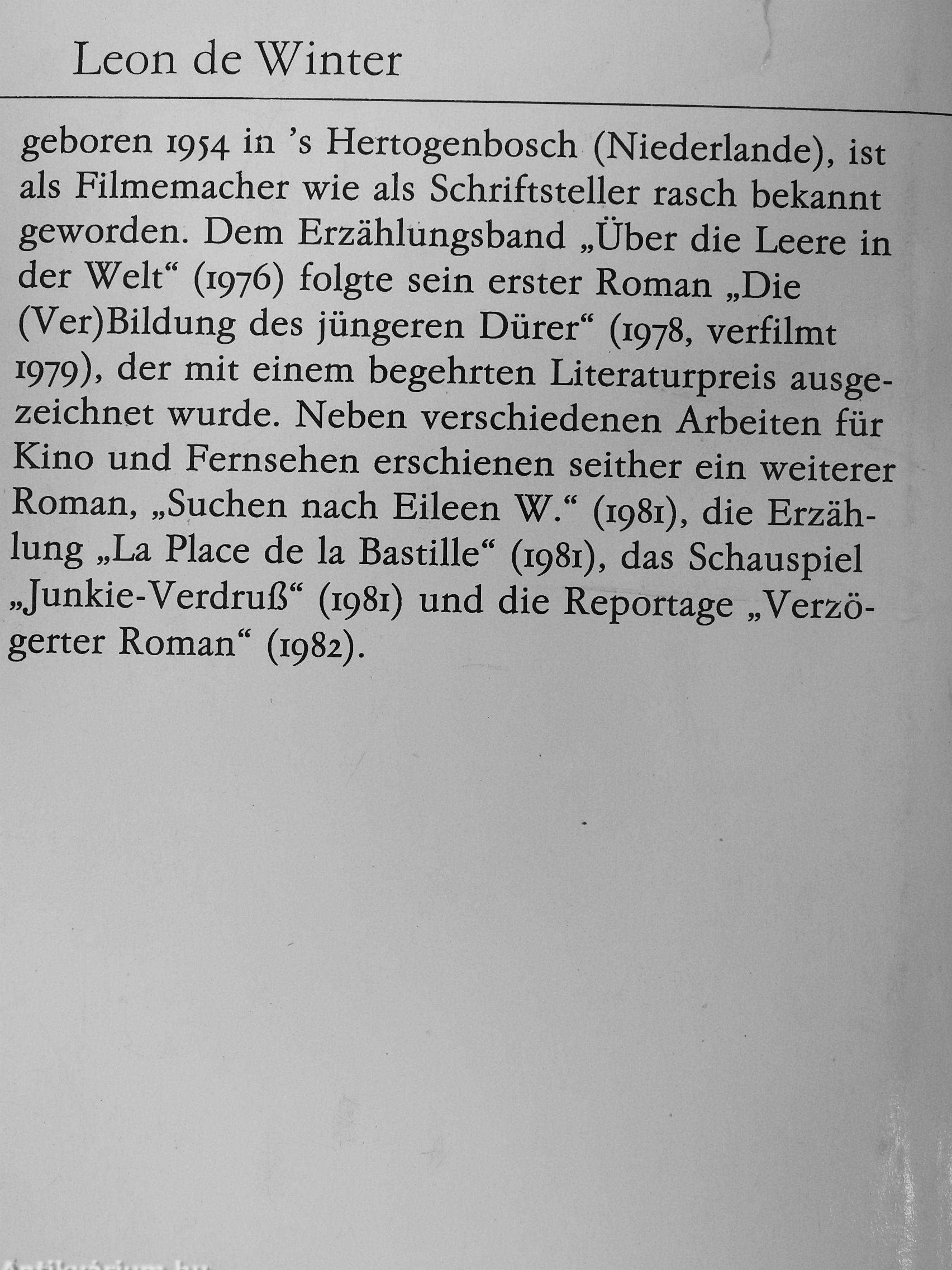 geboren 1954 in 's Hertogenbosch (Niederlande), ist als Filmemacher wie als Schriftsteller rasch bekannt geworden. Dem Erzählungsband „Über die Leere in der Welt" (1976) folgte sein erster Roman „Die (Ver)Bildung des jüngeren Dürer" (1978, verfilmt 1979), der mit einem begehrten Literaturpreis ausgezeichnet wurde. Neben verschiedenen Arbeiten für Kino und Fernsehen erschienen seither ein weiterer Roman, „Suchen nach Eileen W." (1981), die Erzählung „La Place de la Bastille" (1981), das Schauspiel „Junkie-Verdruß" (1981) und die Reportage „Verzögerter Roman" (1982). Vissza