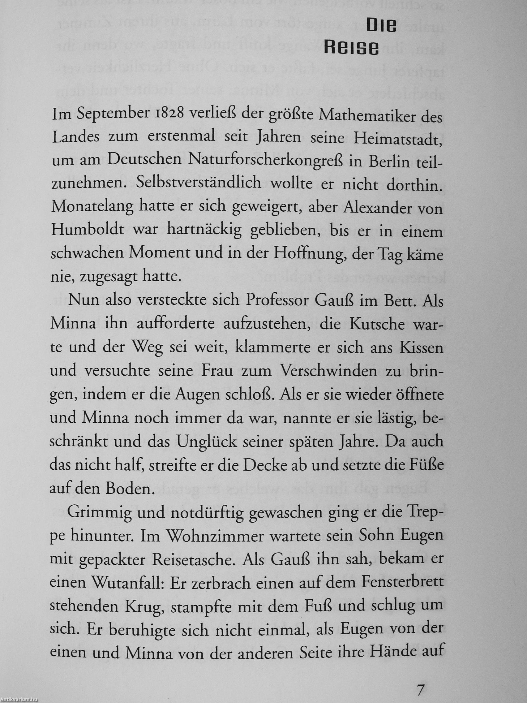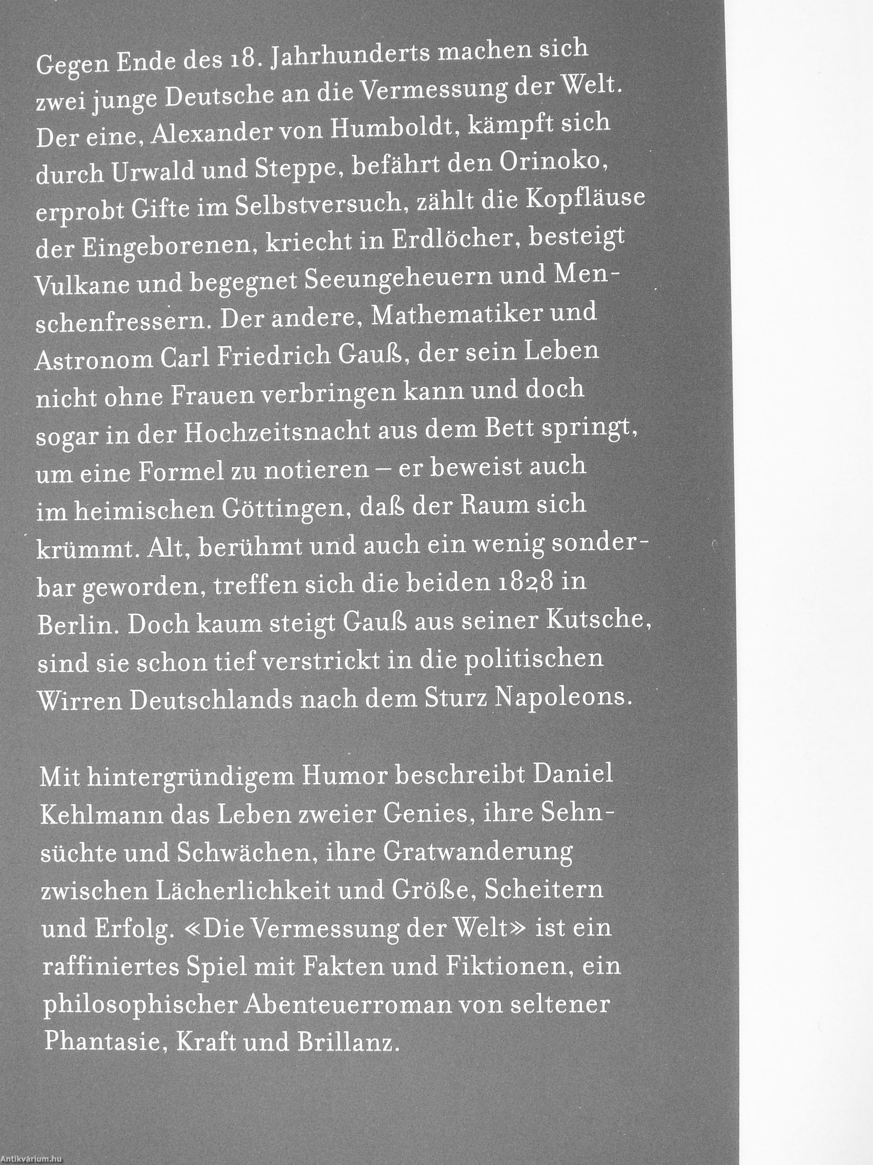 Gegen Ende des 18. Jahrhunderts machen sich zwei junge Deutsche an die Vermessung der Welt. Der eine, Alexander von Humboldt, kämpft sich durch Urwald und Steppe, befährt den Orinoko, erprobt Gifte im Selbstversuch, zählt die Kopfläuse der Eingeborenen, kriecht in Erdlöcher, besteigt Vulkane und begegnet Seeungeheuern und Menschenfressern. Der andere, Mathematiker und Astronom Carl Friedrich Gauß, der sein Leben nicht ohne Frauen verbringen kann und doch sogar in der Hochzeitsnacht aus dem Bett springt, um eine Formel zu notieren - er beweist auch im heimischen Göttingen, daß der Raum sich krümmt. Alt, berühmt und auch ein wenig sonderbar geworden, treffen sich die beiden i8?8 in Berlin. Doch kaum steigt Gauß, aus seiner Kutsche, sind sie schon tief verstrickt in die politischen Wirren Deutschlands nach dem Sturz Napoleons.