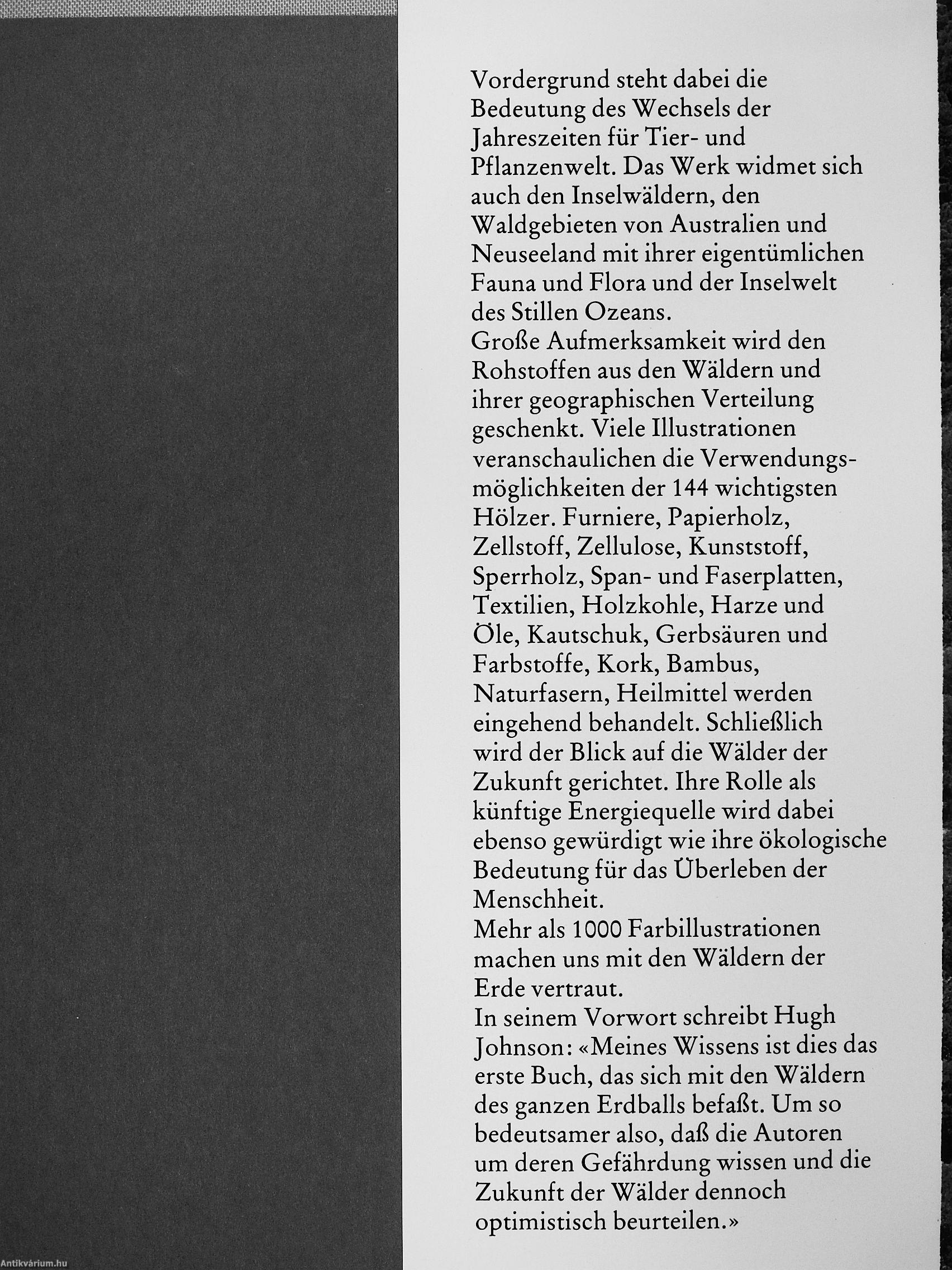 In seinem Vorwort schreibt Hugh Johnson: «Meines Wissens ist dies das erste Buch, das sich mit den Wäldern des ganzen Erdballs befaßt. Um so bedeutsamer also, daß die Autoren um deren Gefährdung wissen und die Zukunft der Wälder dennoch optimistisch beurteilen.»