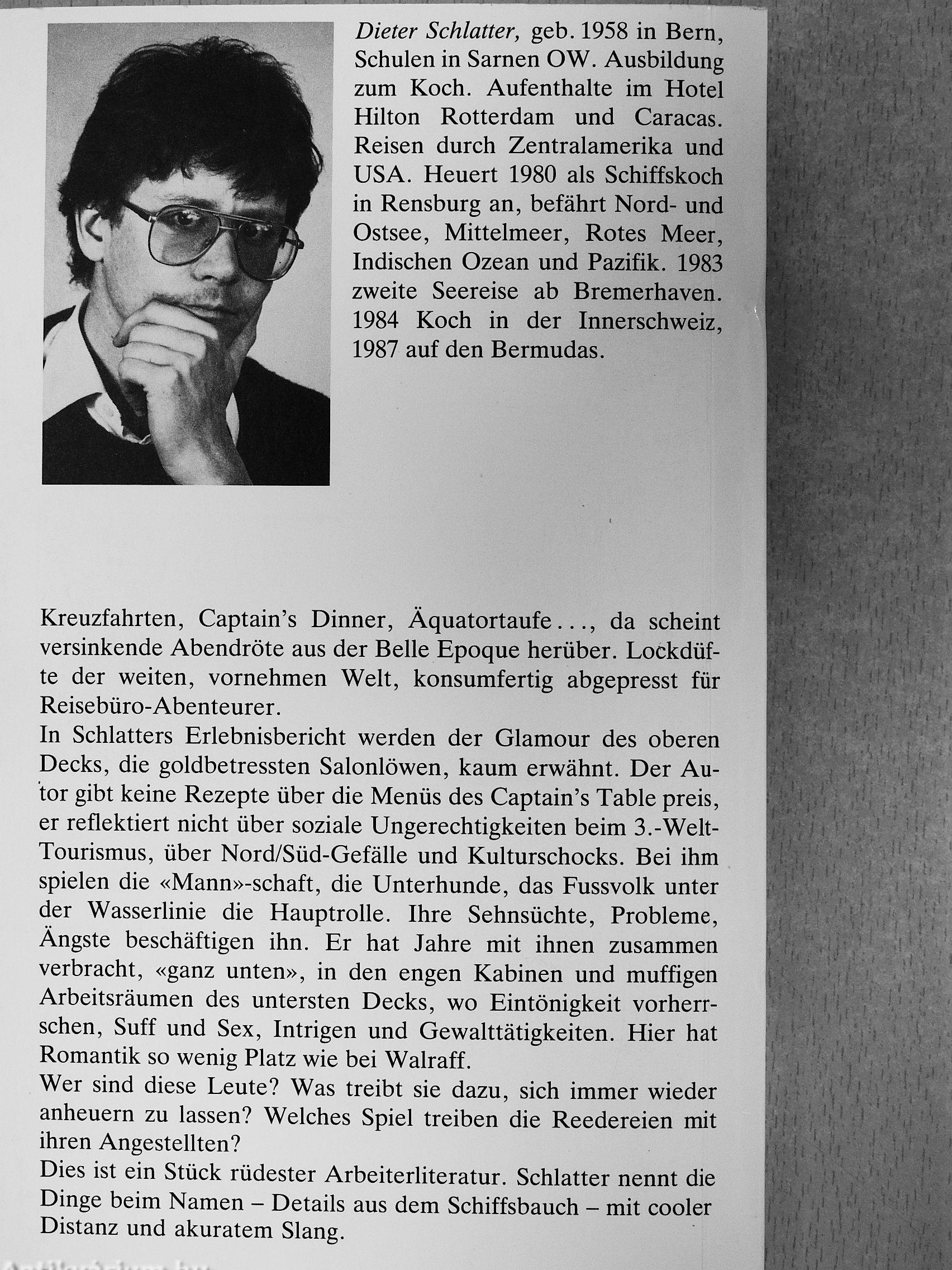 Dieter Schlatter, geb. 1958 in Bern, Schulen in Samen OW. Ausbildung zum Koch. Aufenthalte im Hotel Hilton Rotterdam und Caracas. Reisen durch Zentralamerika und USA. Heuert 1980 als Schiffskoch in Rensburg an, befährt Nord- und Ostsee, Mittelmeer, Rotes Meer, Indischen Ozean und Pazifik. 1983 zweite Seereise ab Bremerhaven. 1984 Koch in der Innerschweiz, 1987 auf den Bermudas.